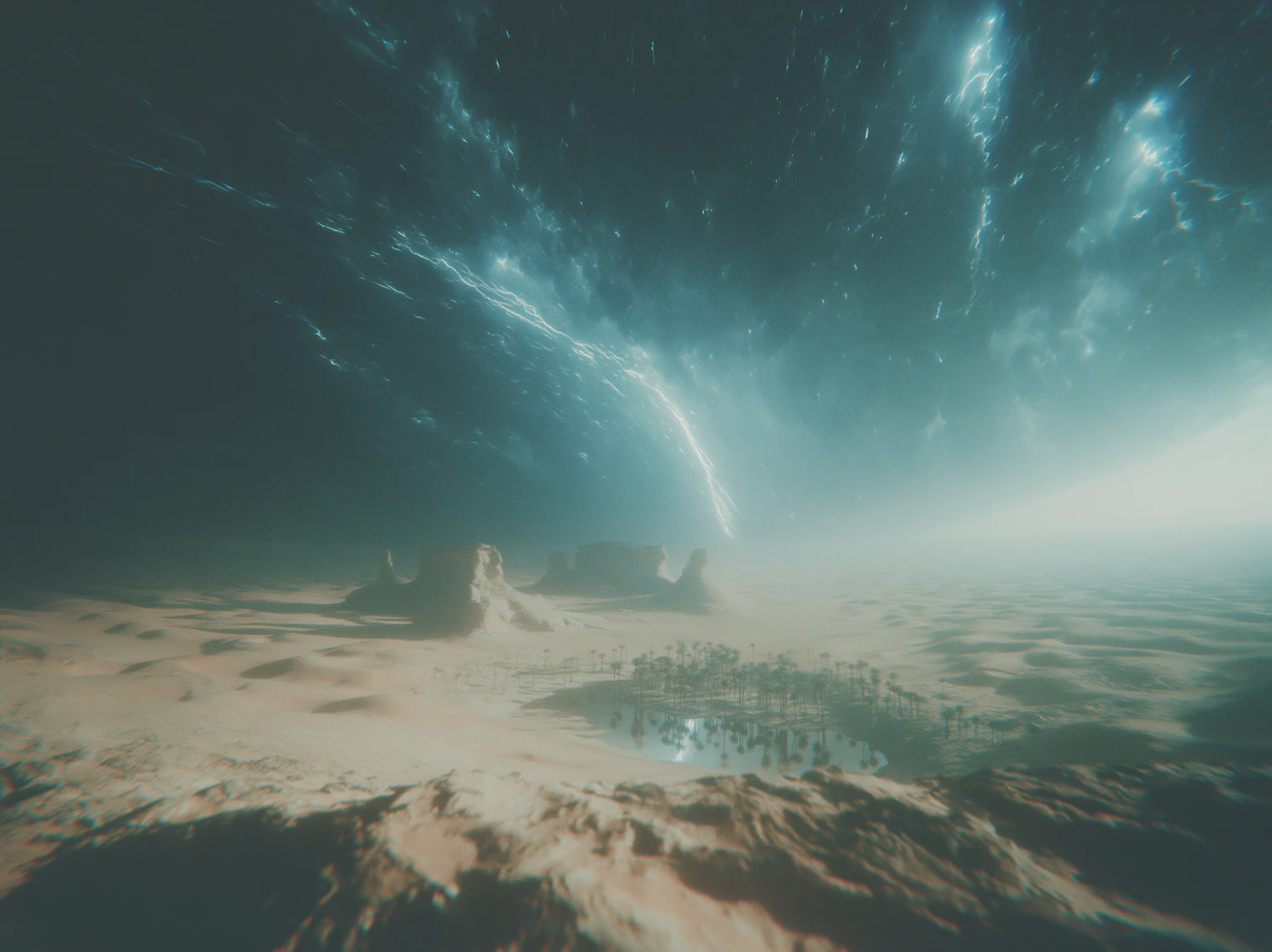 A surreal desert scene with dunes, an oasis, and glowing streaks of light in the sky, creating a cosmic and otherworldly atmosphere.