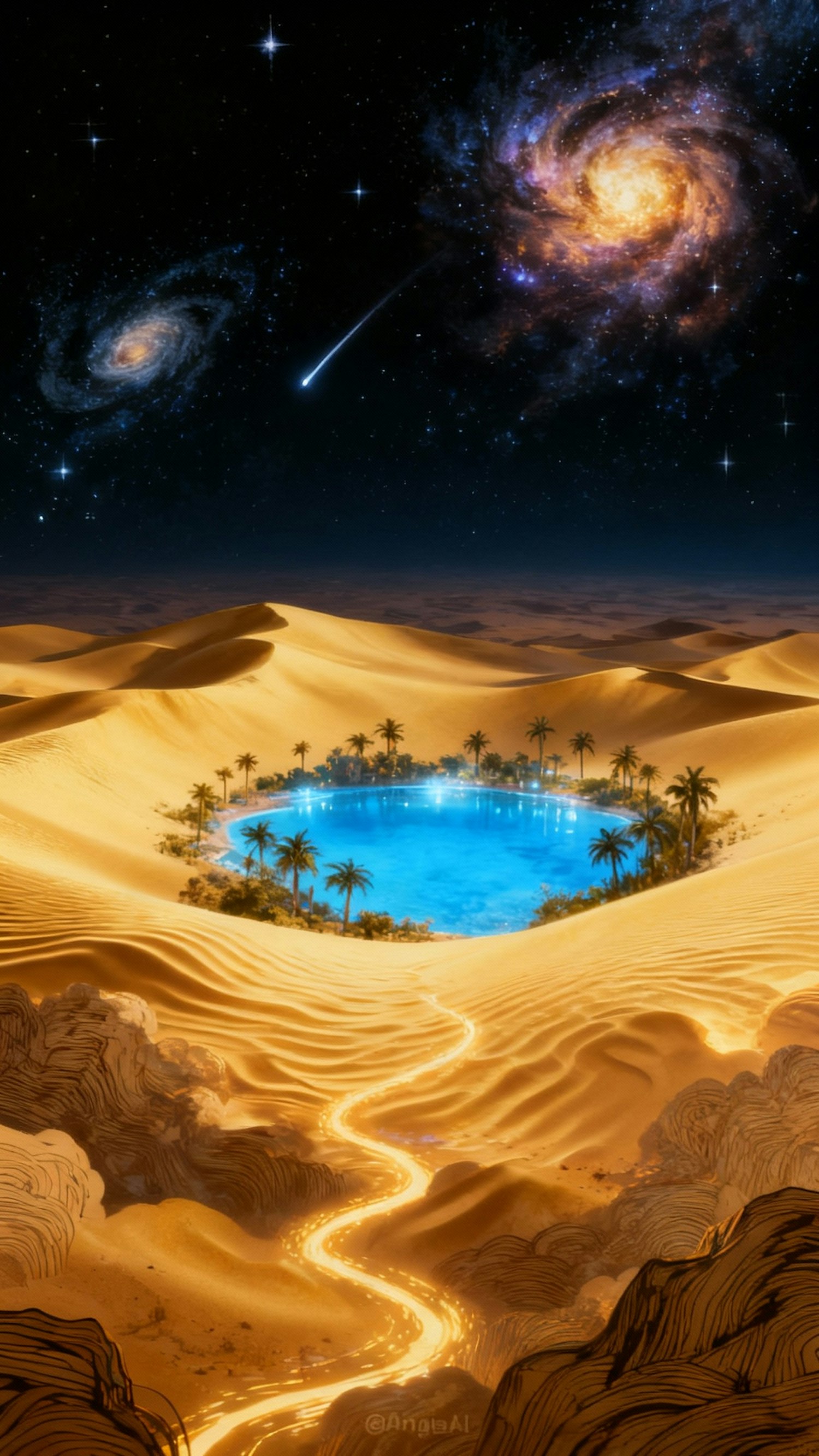 A glowing desert oasis under a starry sky with galaxies and a shooting star, featuring golden dunes and a vibrant blue water pool.