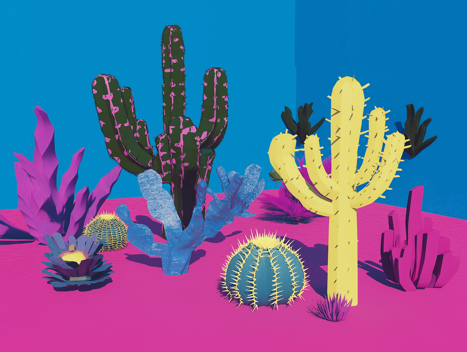Colorful surreal desert scene with vibrant cacti and succulents on a pink and blue background.