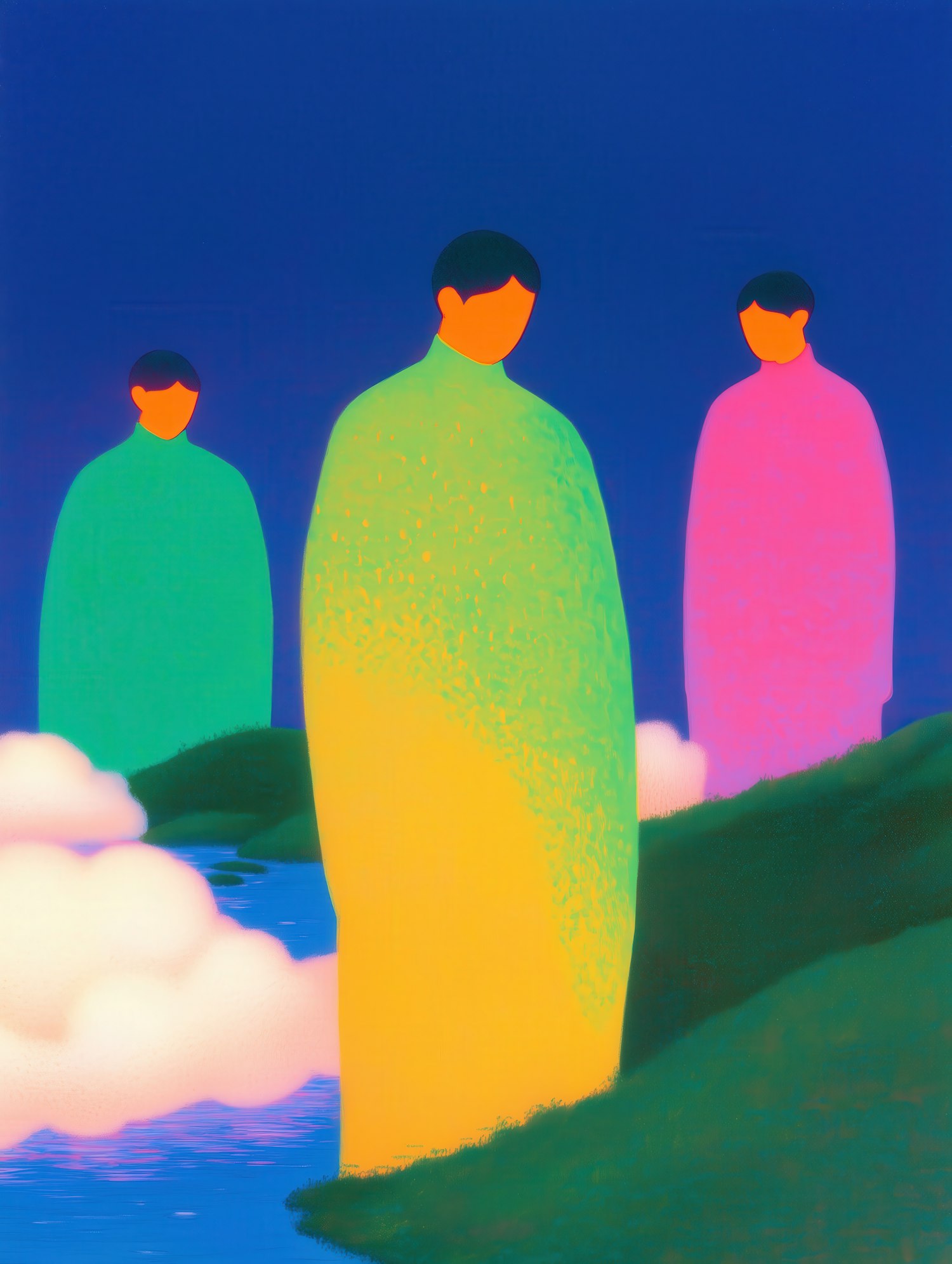 Surreal illustration of three glowing figures in vibrant robes, set against a dreamy blue sky, water, and rolling green hills.