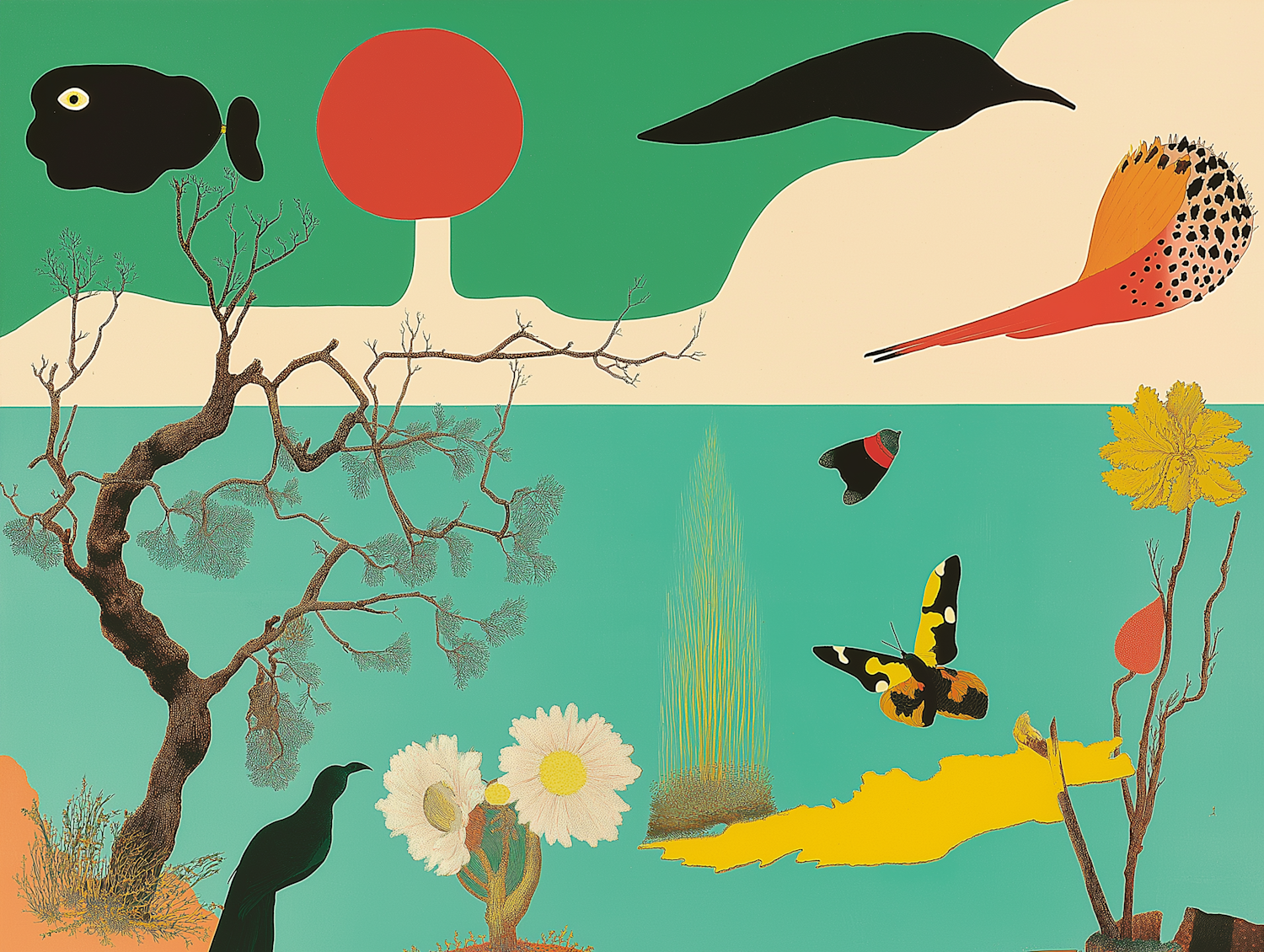 Surreal illustration with abstract shapes, a red sun, twisted tree, black bird, and colorful butterflies on a vibrant green background.