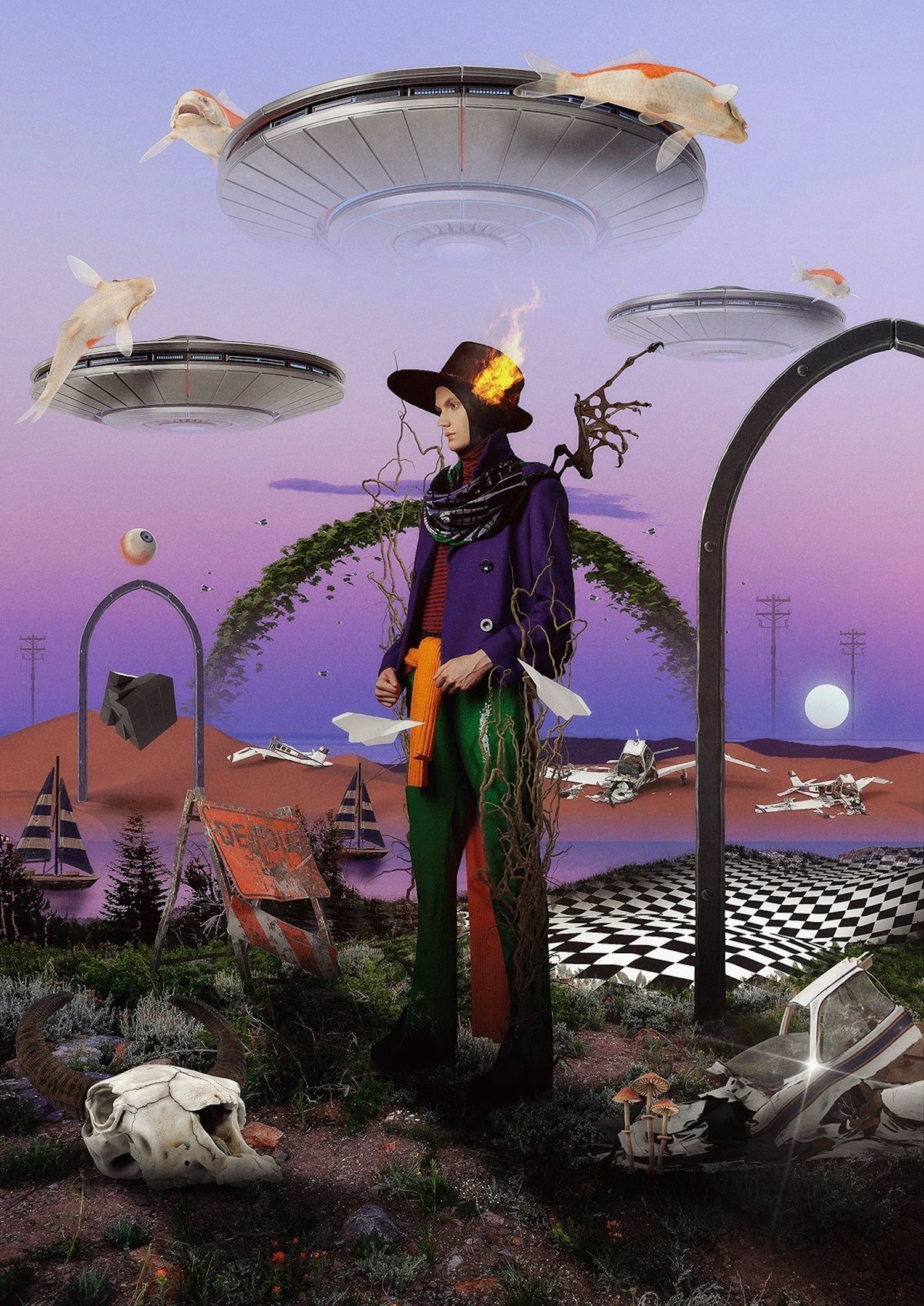 A surreal artwork with a person in vibrant attire, UFOs, floating fish, and a dreamlike landscape with vivid colors and abstract elements.