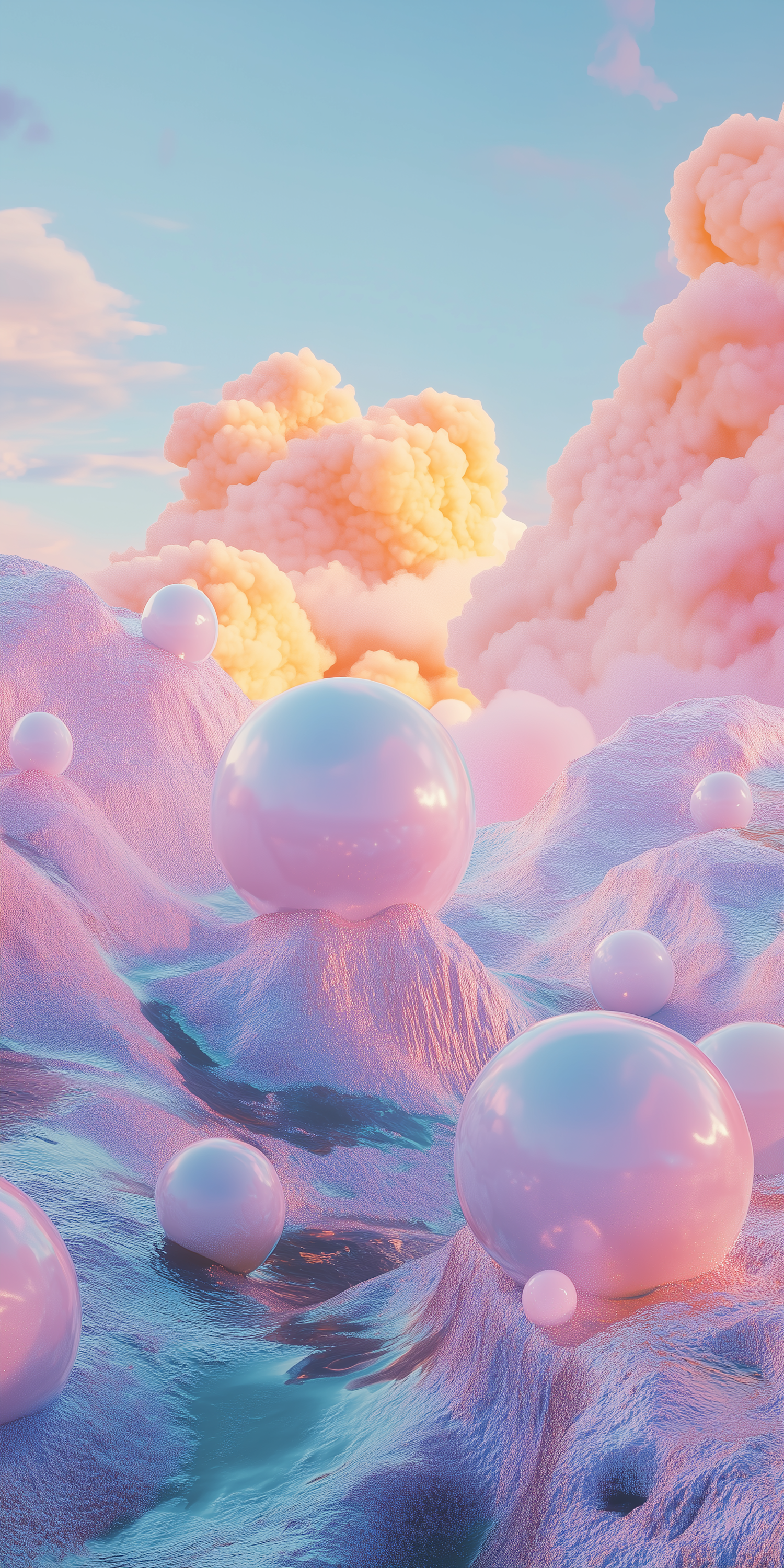 Dreamy pastel landscape with reflective spheres, shimmering pink hills, and fluffy peach clouds under a serene blue sky.
