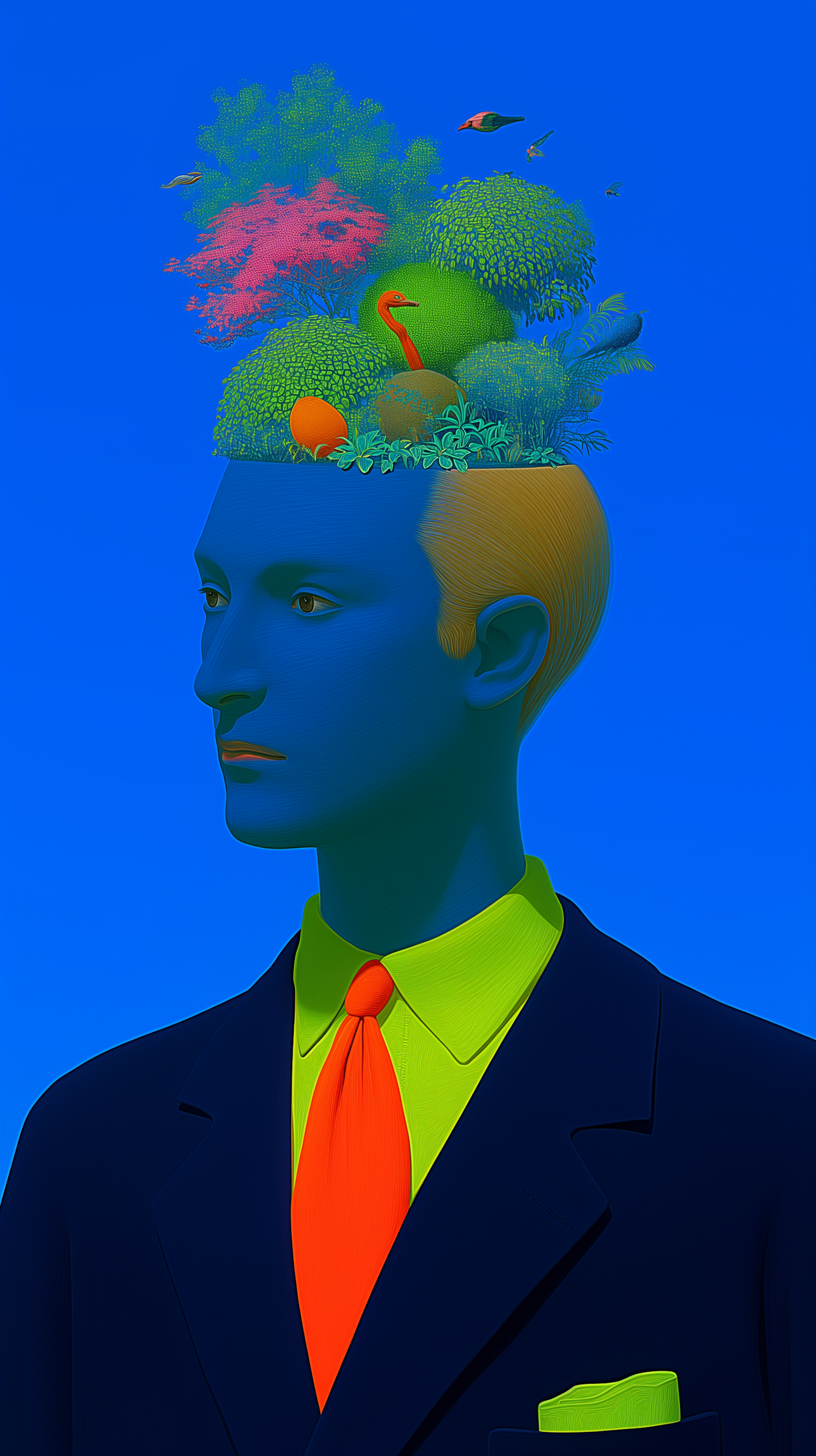 Surreal artwork of a person with a vibrant ecosystem growing from their head, set against a vivid blue background.