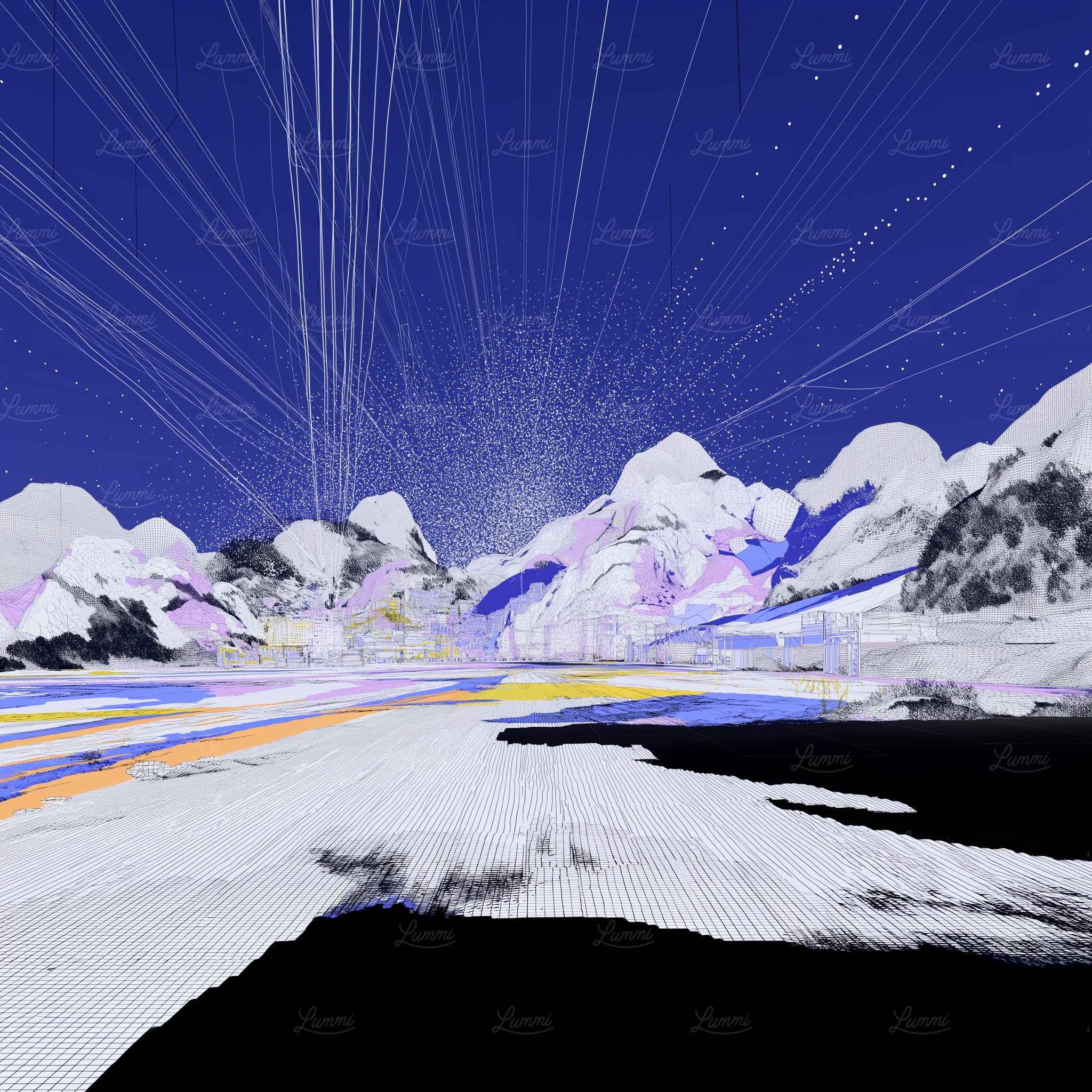 A surreal digital artwork of a mountainous landscape with vibrant colors, dynamic lines, and a grid-like foreground.
