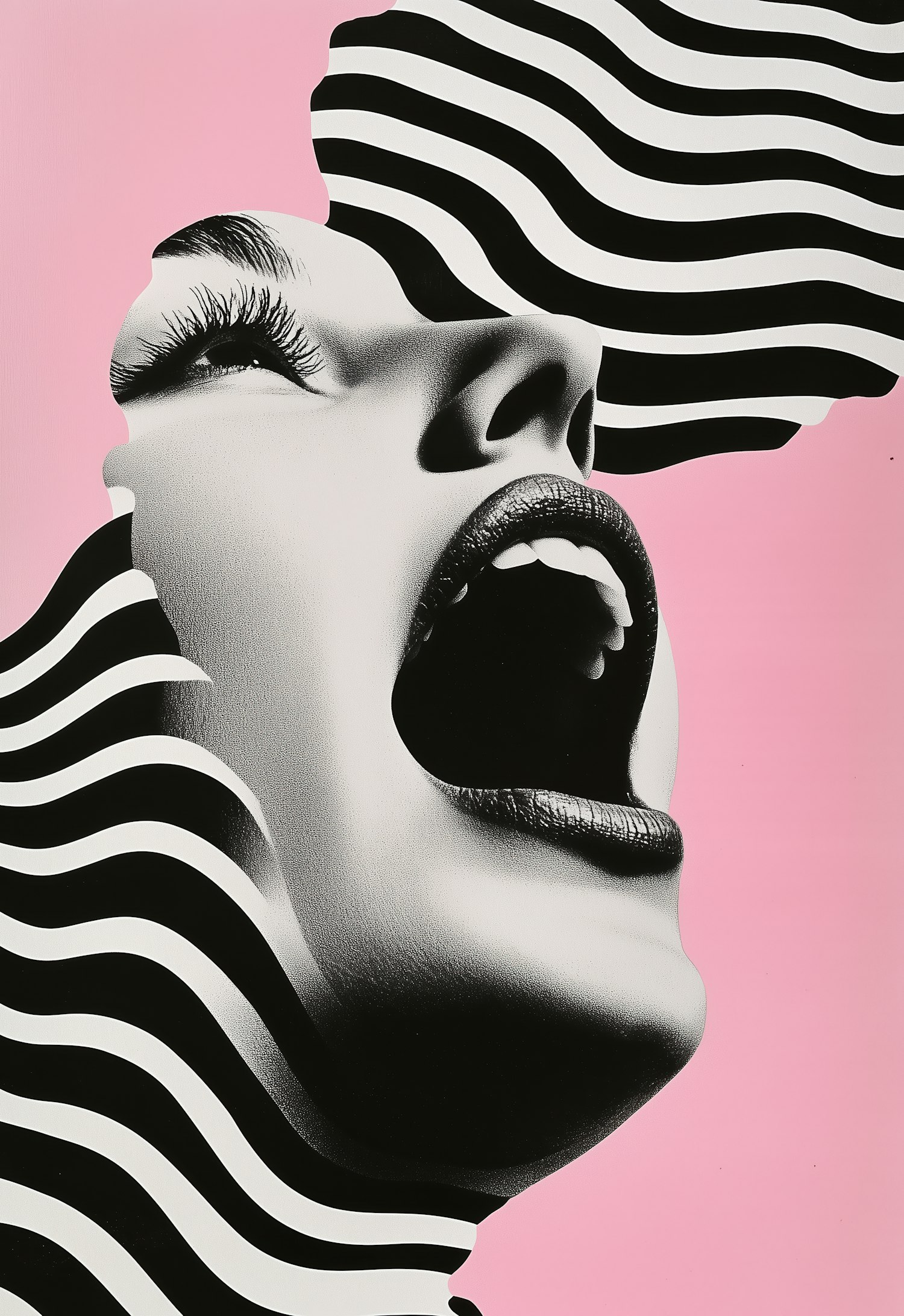 Abstract illustration of a woman's face with wavy lines and a pink background, creating a dynamic and bold visual effect.