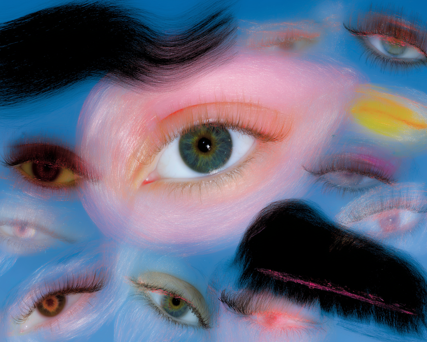 A surreal artwork of multiple eyes with vibrant colors and textures, blending realism and abstraction in a captivating composition.