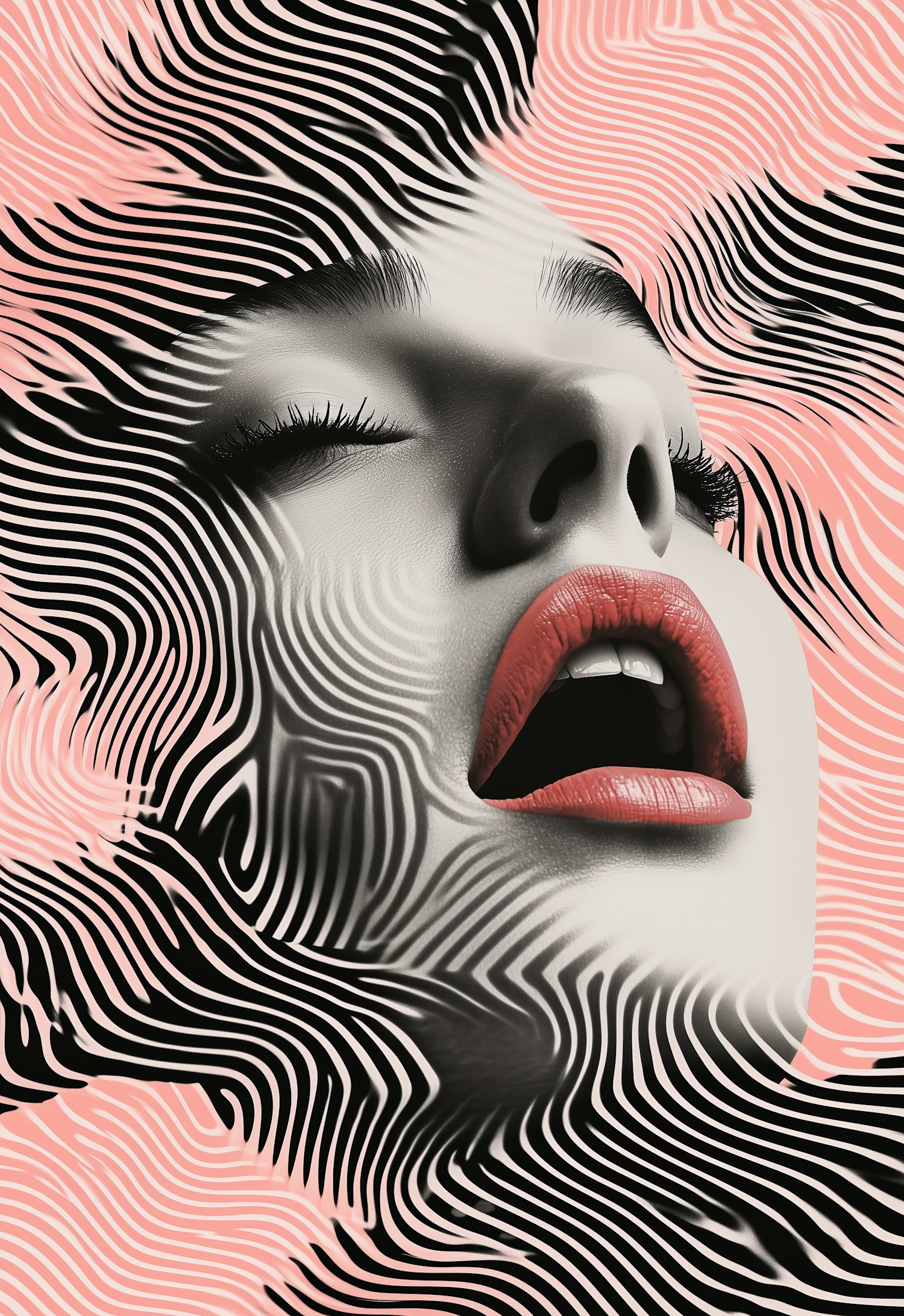Surreal illustration of a woman's face with vivid red lips and hypnotic black and white lines on a soft pink background.