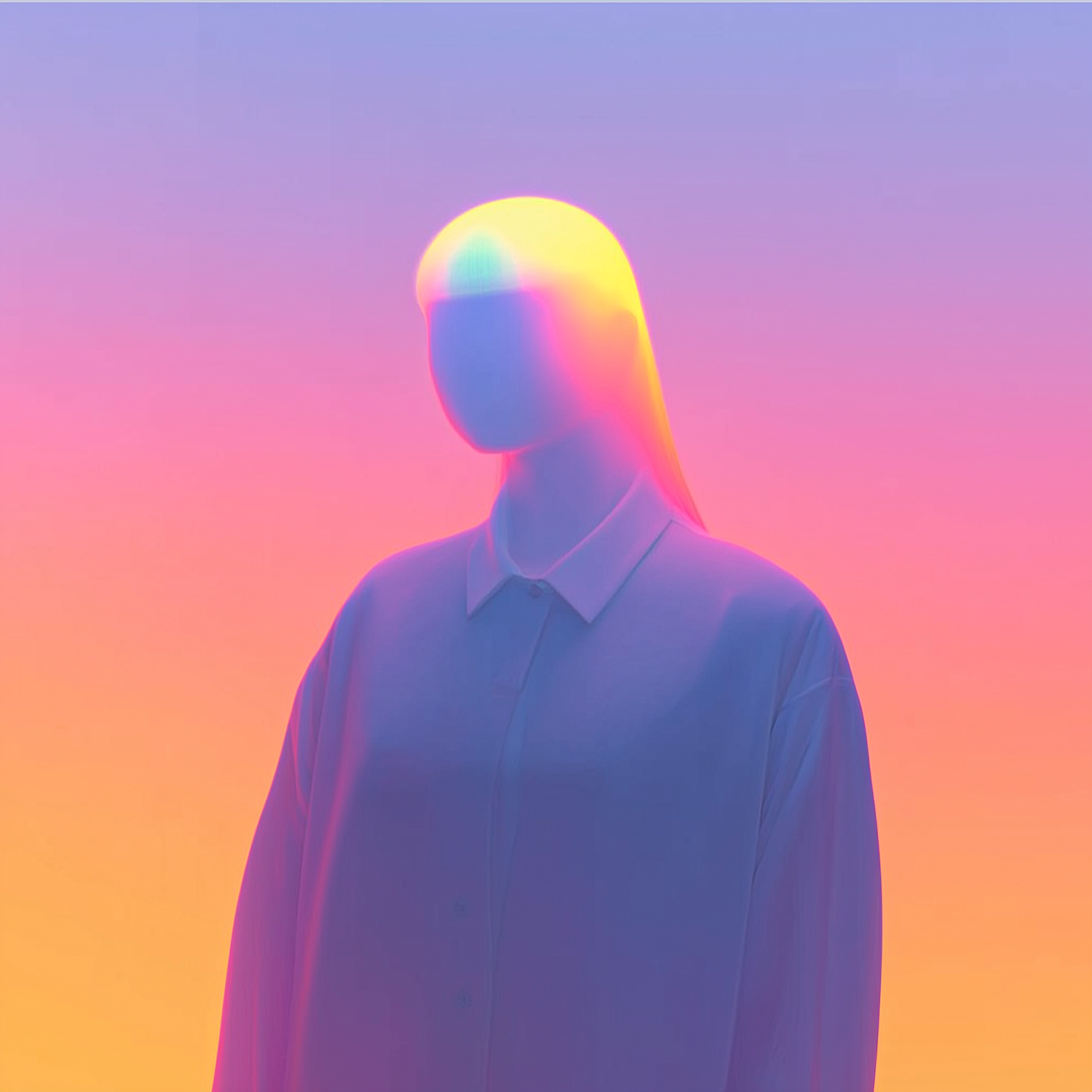 A surreal digital artwork of a faceless figure with glowing gradient colors, blending into a pastel background for a minimalist aesthetic.