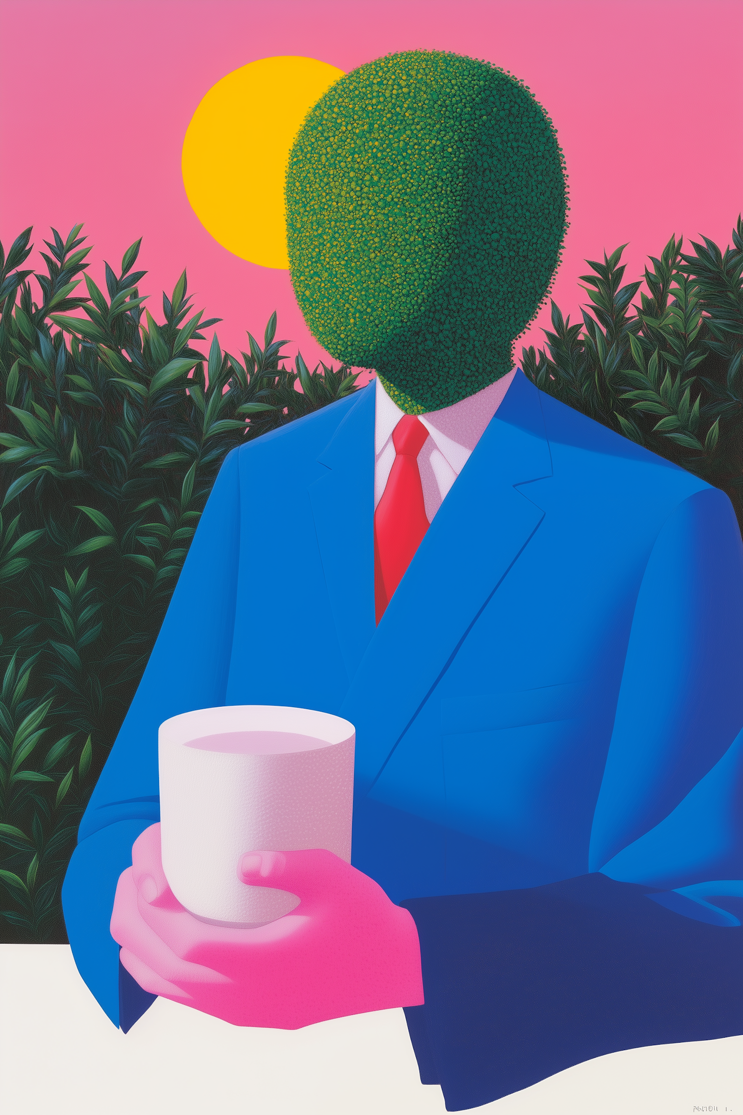 Surreal illustration of a figure with a bush for a head, in a blue suit, holding a cup. Vibrant pink sky and yellow sun in the background.