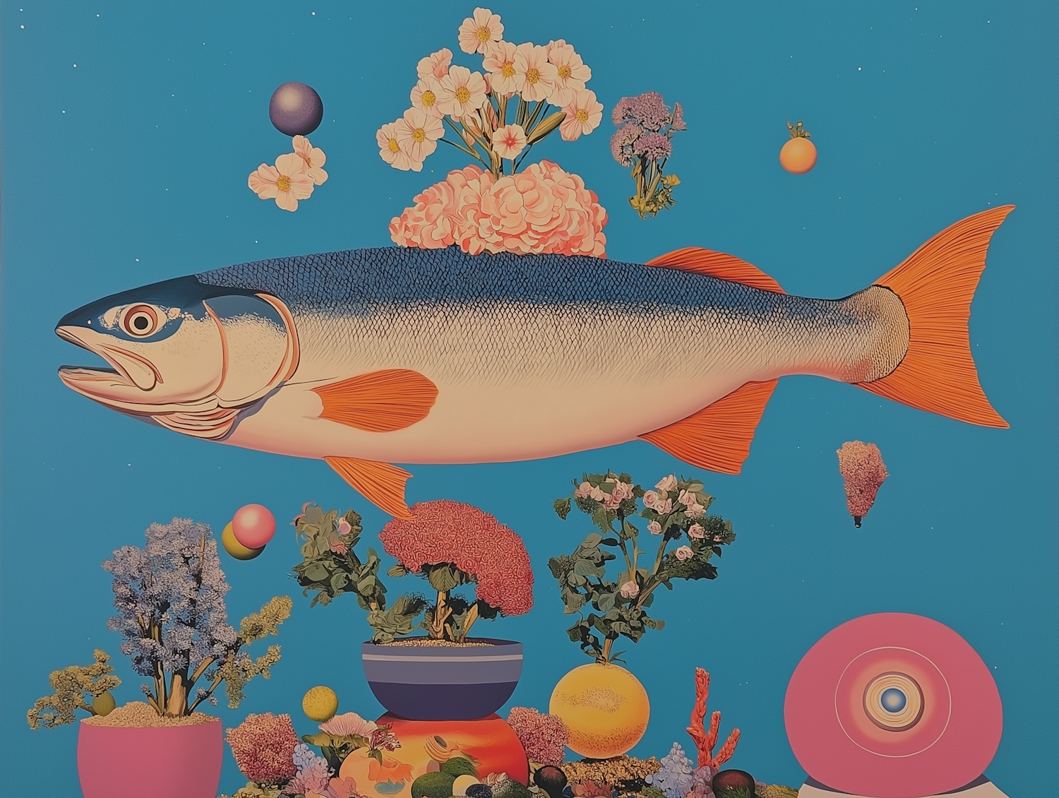 Surreal illustration of a fish surrounded by colorful flowers and abstract elements on a vibrant blue background.