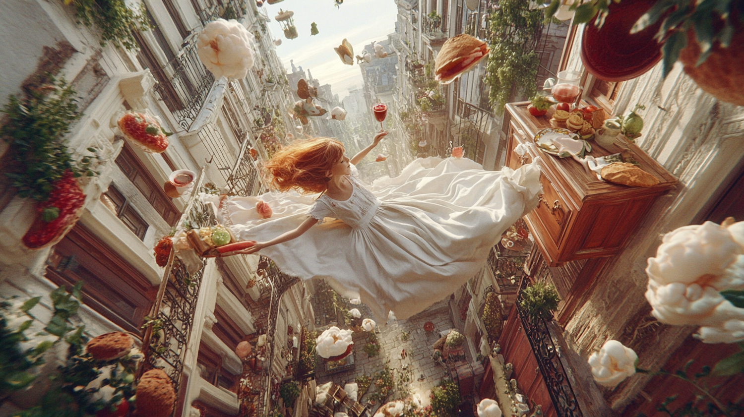 Surreal image of a red-haired woman floating in a European street surrounded by suspended food and warm golden light.