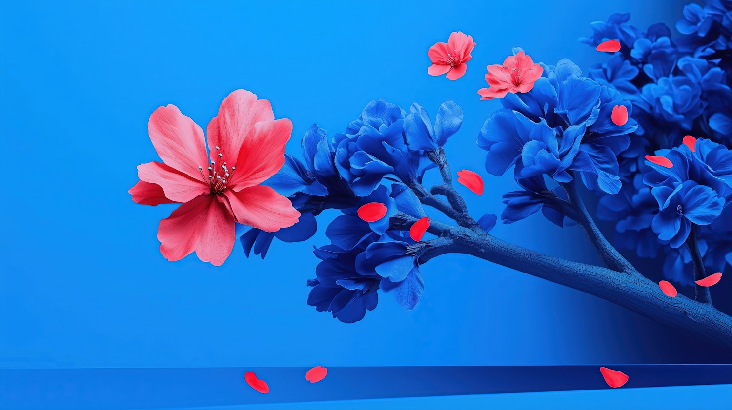 A surreal floral scene with vivid pink and blue blossoms on a branch, set against a bold blue background with scattered petals.