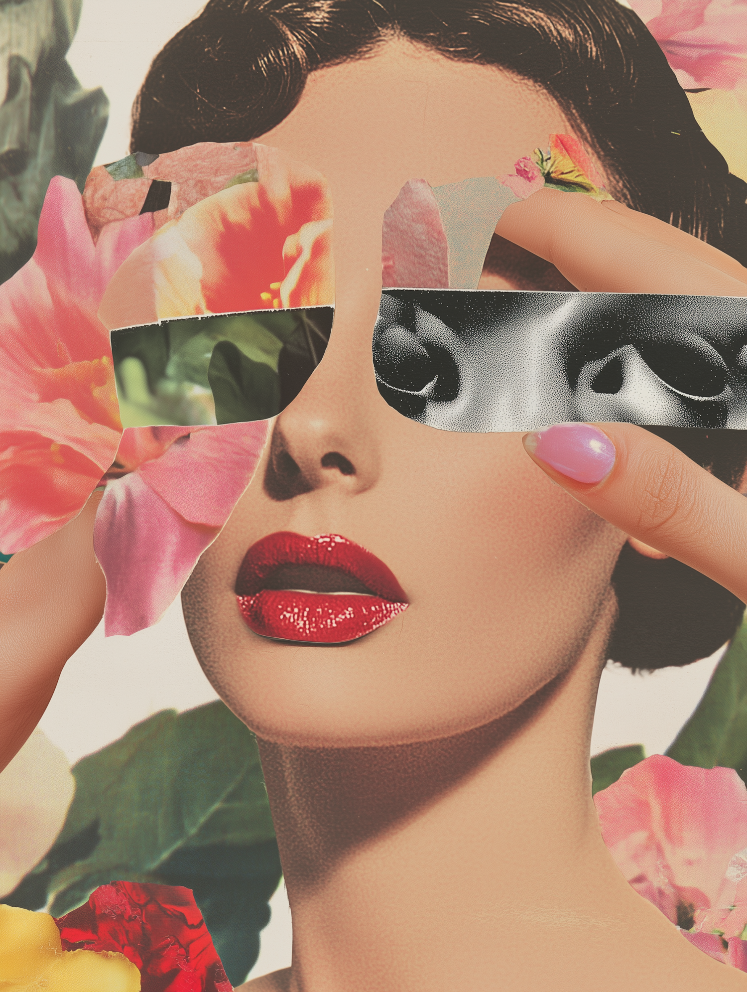 A vibrant surreal collage of a woman's portrait with floral and abstract elements, blending fashion and art in a striking composition.