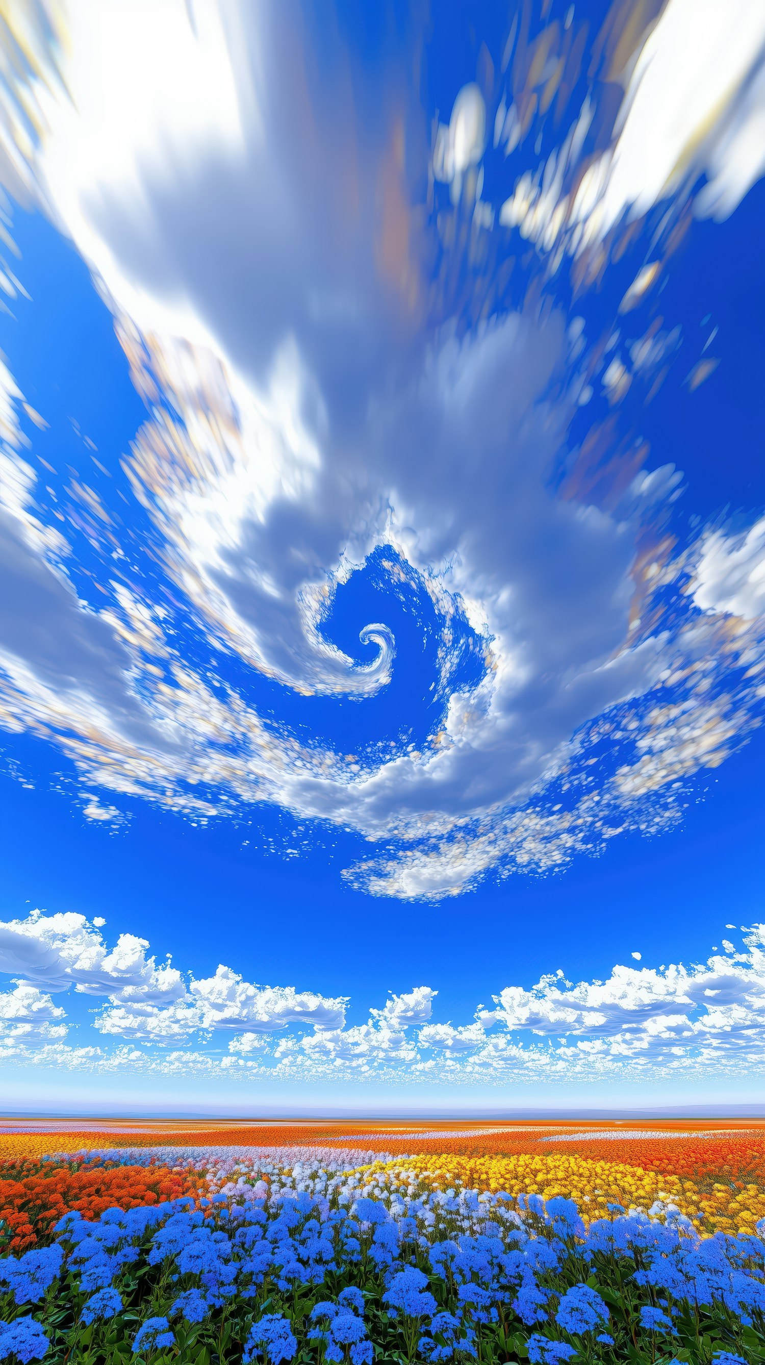 A surreal landscape with vibrant flower fields and swirling spiral clouds in a vivid blue sky, creating a dynamic and colorful scene.