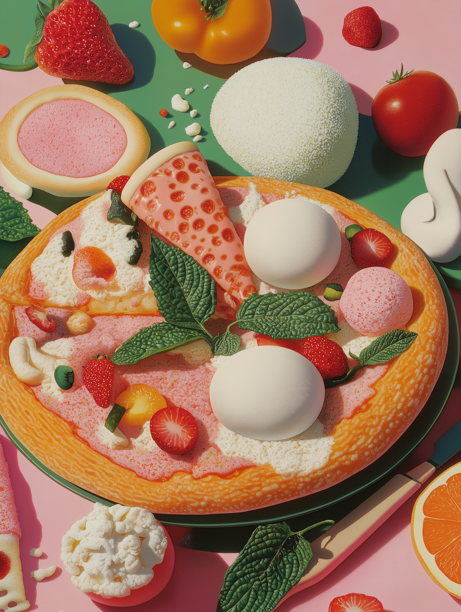 Surreal pizza illustration with strawberries, mint, and colorful toppings on a vibrant pink and green background.