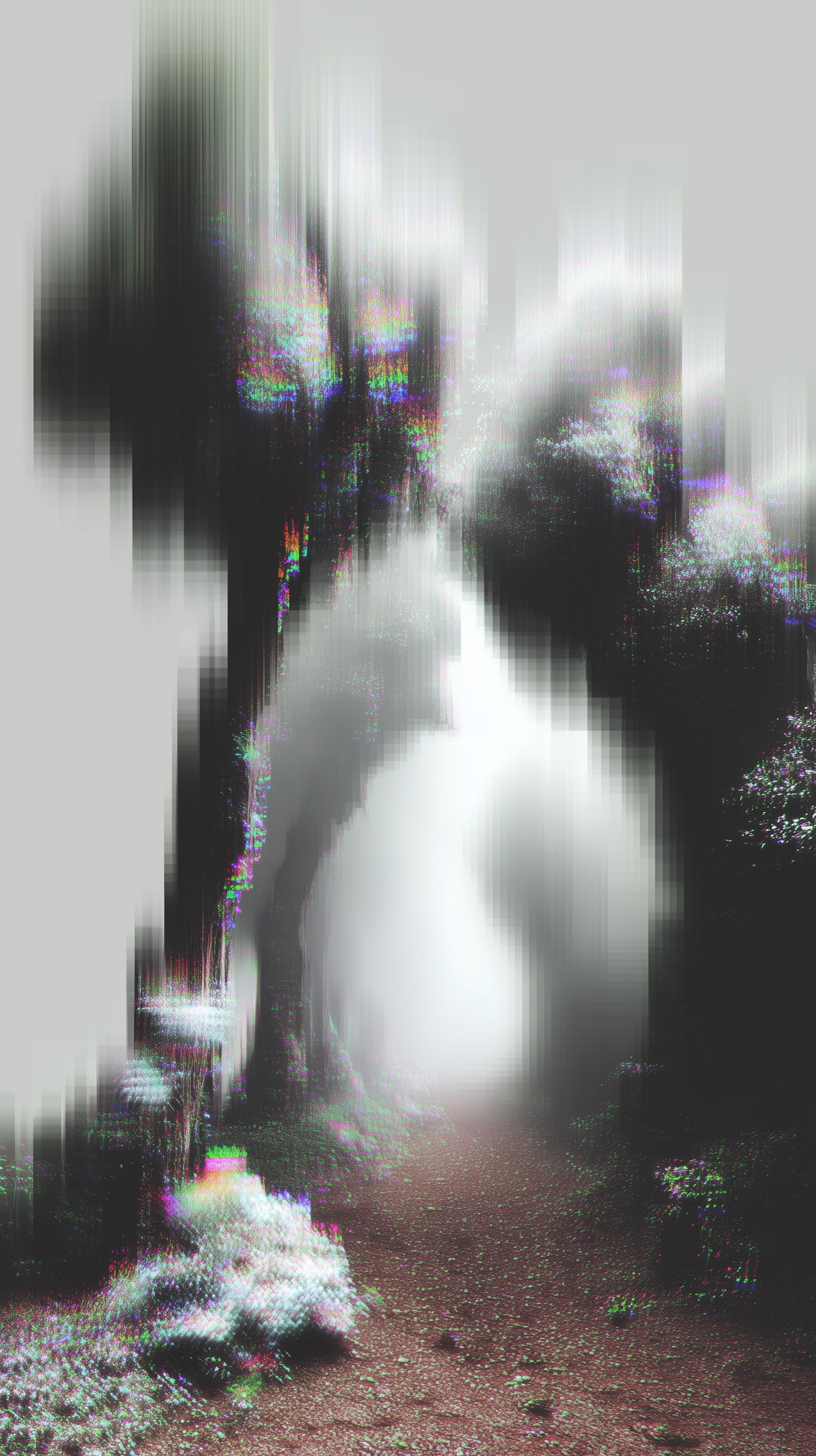 A surreal forest path shrouded in mist, with glitch-like distortions and vibrant prismatic colors creating a dreamlike atmosphere.