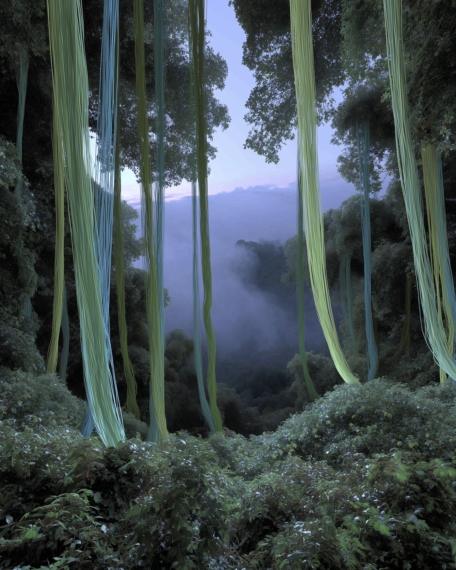 Surreal forest with colorful hanging strands and a misty valley backdrop, creating a dreamlike and mystical atmosphere.