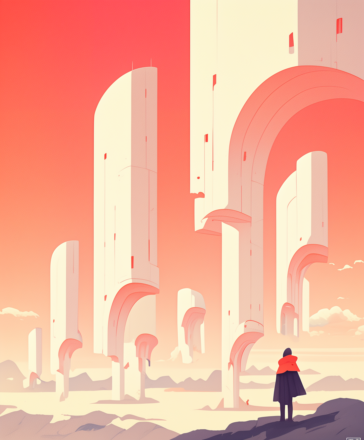 Surreal landscape with futuristic towers and a lone figure in a cloak, set against a warm gradient sky.