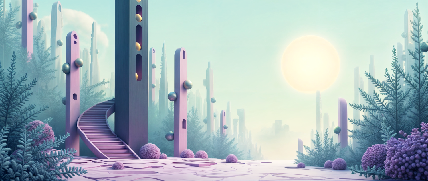 Surreal landscape with pastel monoliths, spherical elements, and lush vegetation under a glowing sun. Futuristic and dreamlike.
