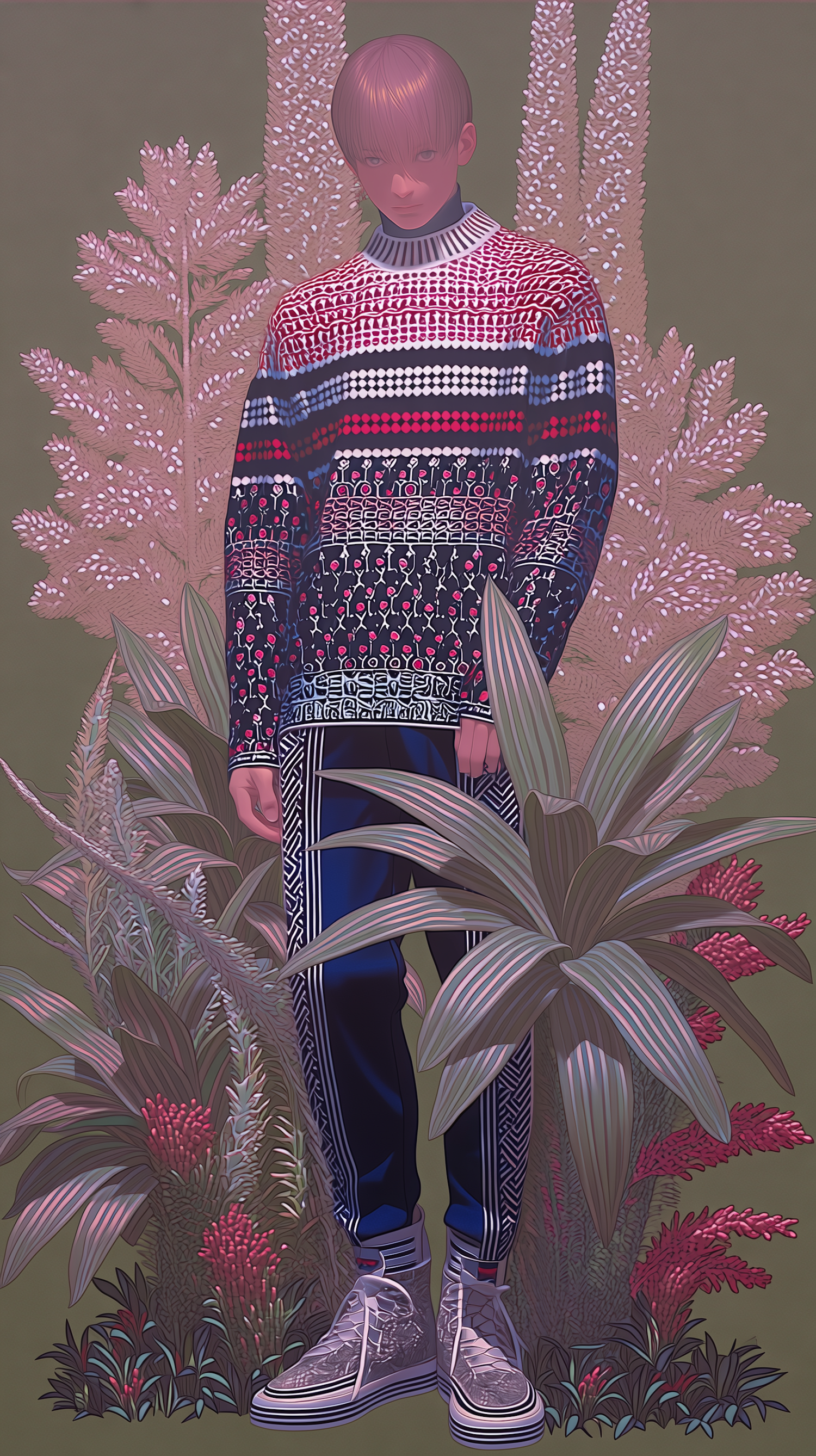 Stylized illustration of a person in a patterned sweater amidst a surreal garden with pastel foliage and intricate details.