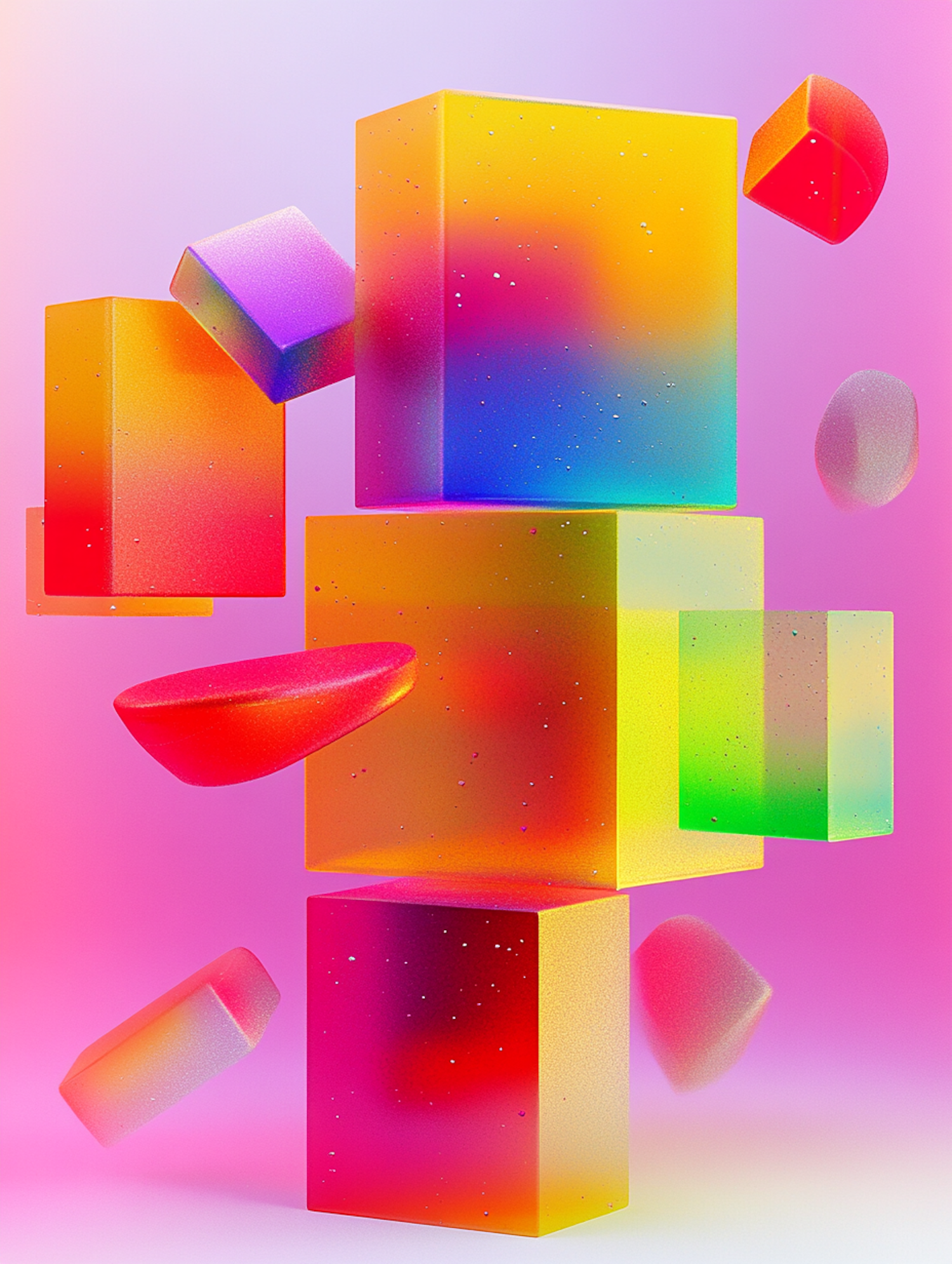 Bright 3D geometric shapes in vivid gradients of yellow, red, and blue float against a soft pink and purple background.