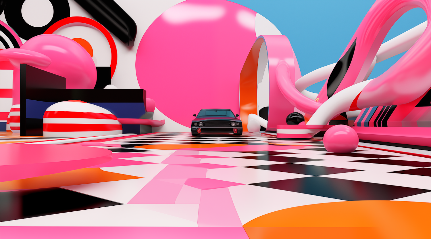 Surreal scene with a black car on a vibrant pink, black, and white checkered floor, surrounded by bold geometric shapes.
