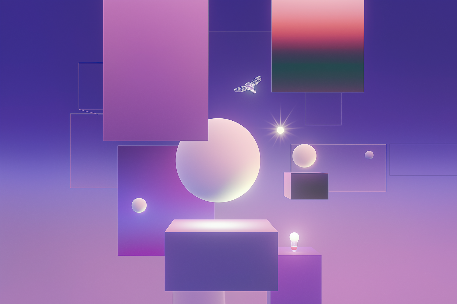 Abstract composition with glowing spheres, cubes, and gradients of purple and pink, creating a surreal and dreamlike atmosphere.