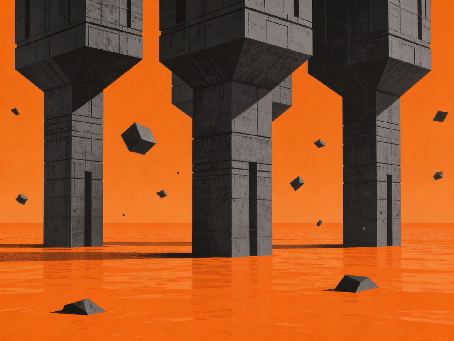 Surreal scene of geometric structures and floating cubes over an orange reflective surface, creating a futuristic and abstract atmosphere.