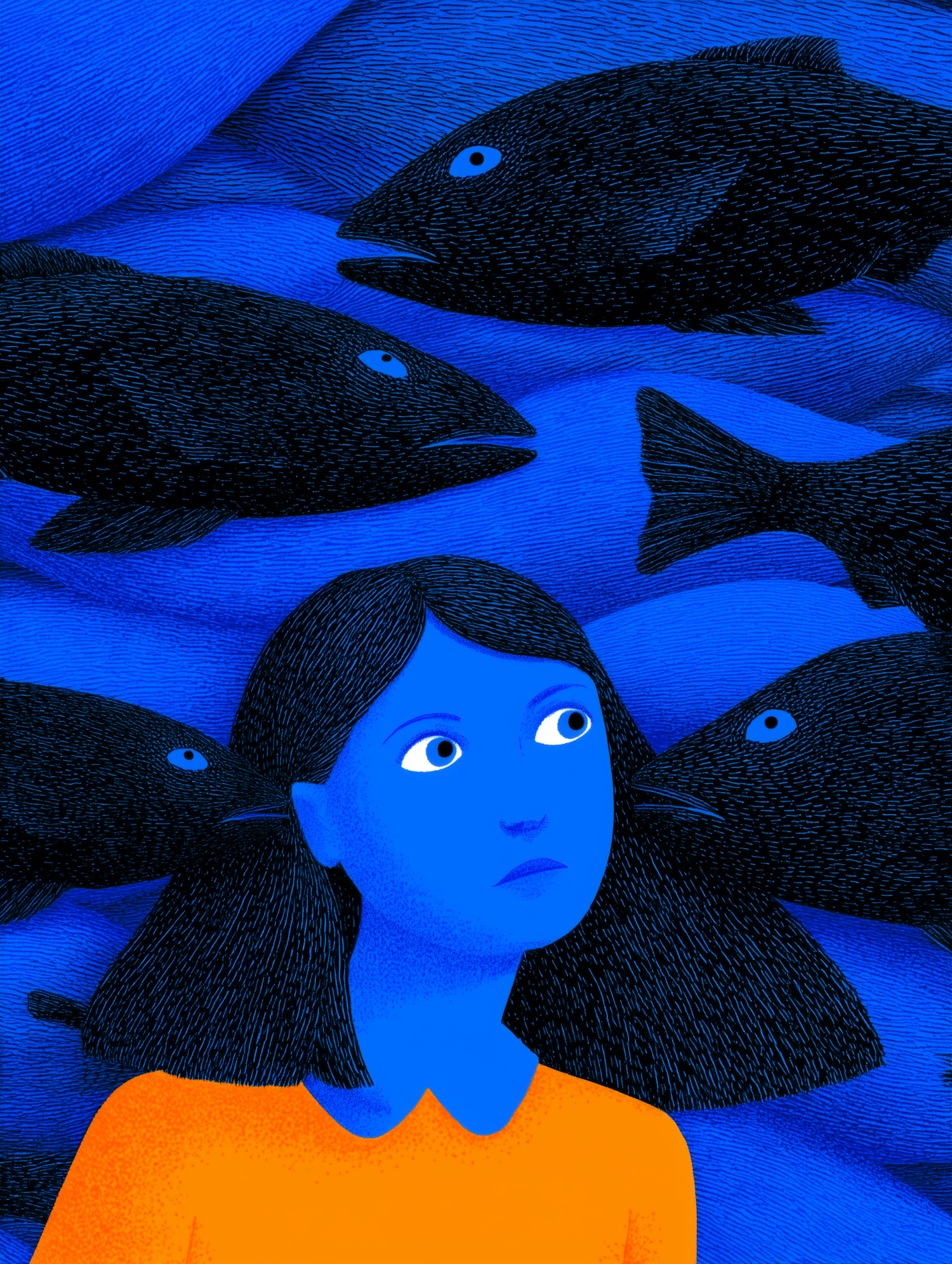 Surreal illustration of a blue-skinned girl in an orange shirt surrounded by dark fish in a deep blue sea, evoking a dreamlike atmosphere.