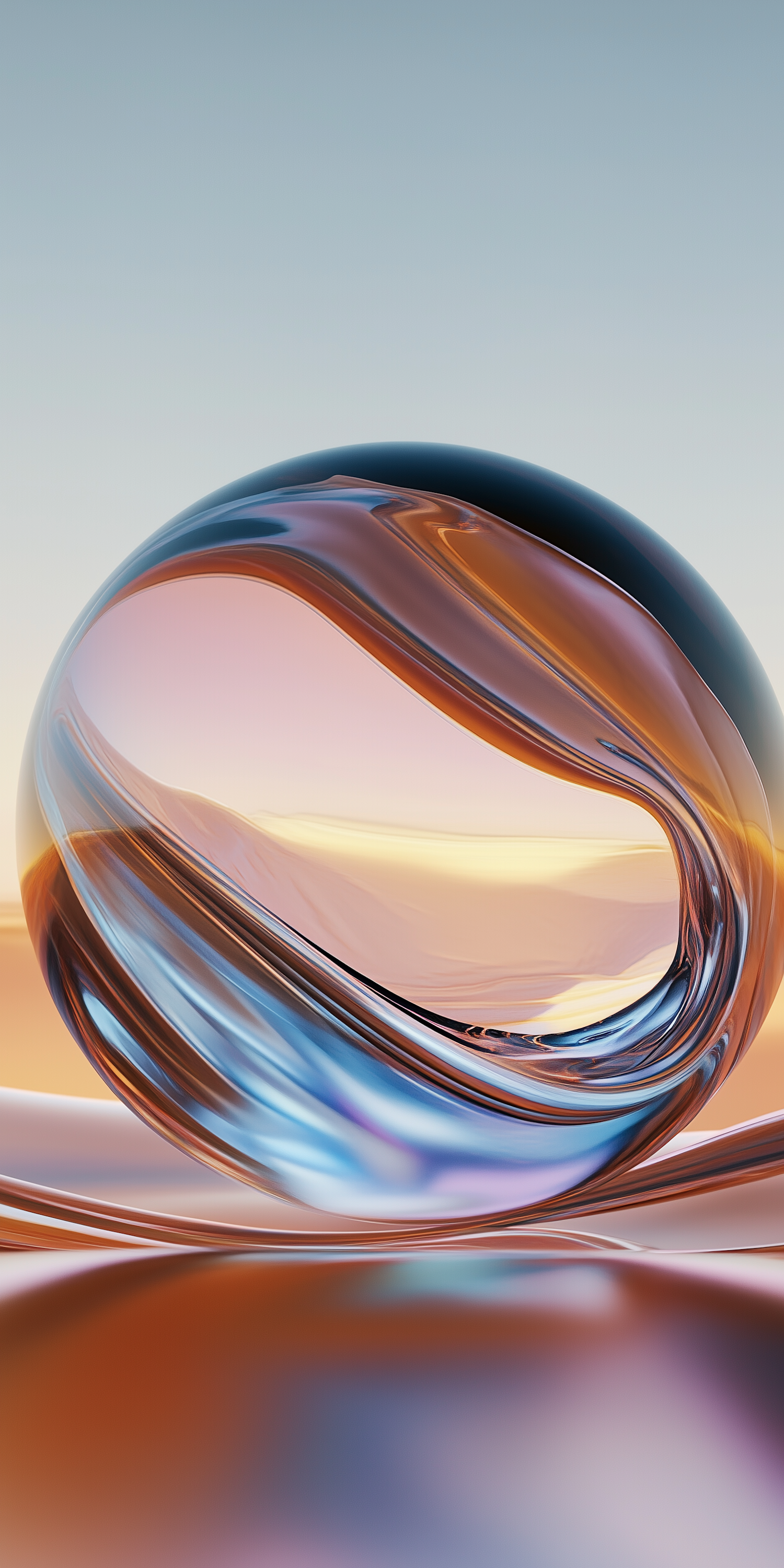 A stunning 3D abstract sphere with flowing colors of blue, orange, and pink on a reflective surface, set against a pastel gradient background.