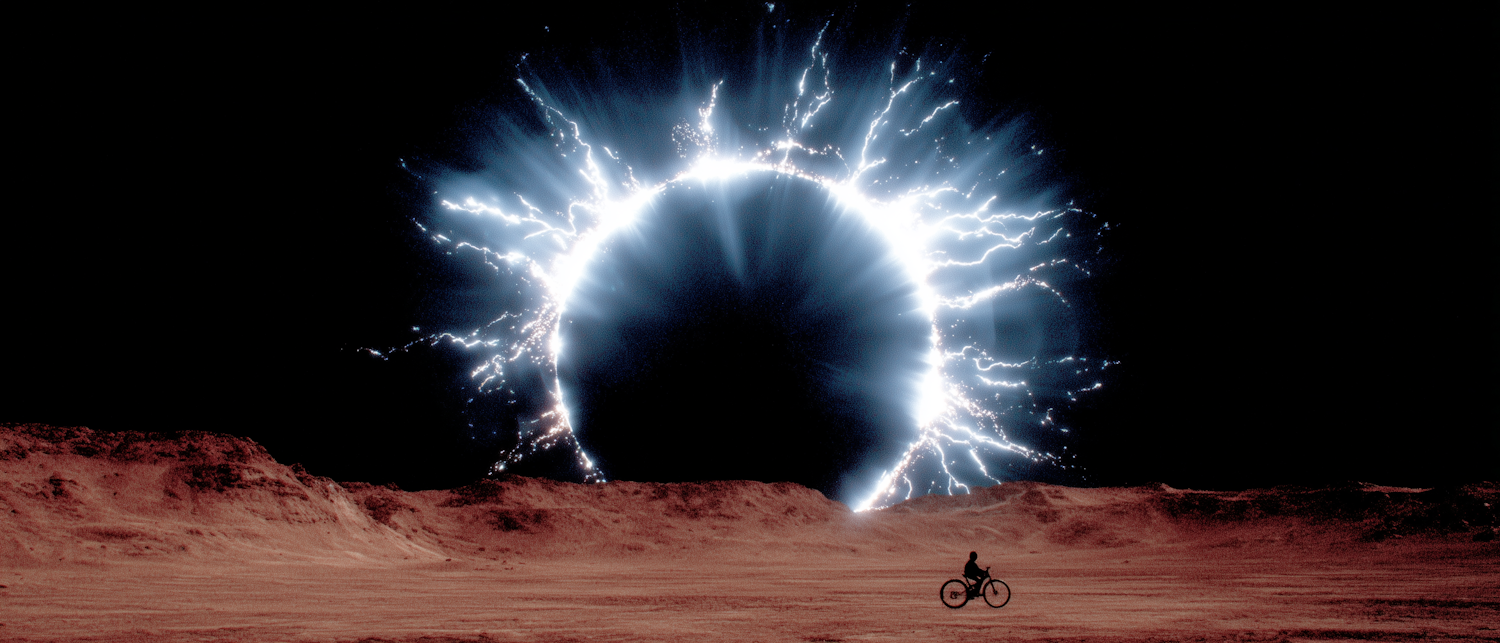 A lone cyclist rides across a barren landscape under a glowing, electric circular phenomenon in the dark sky, creating a surreal scene.