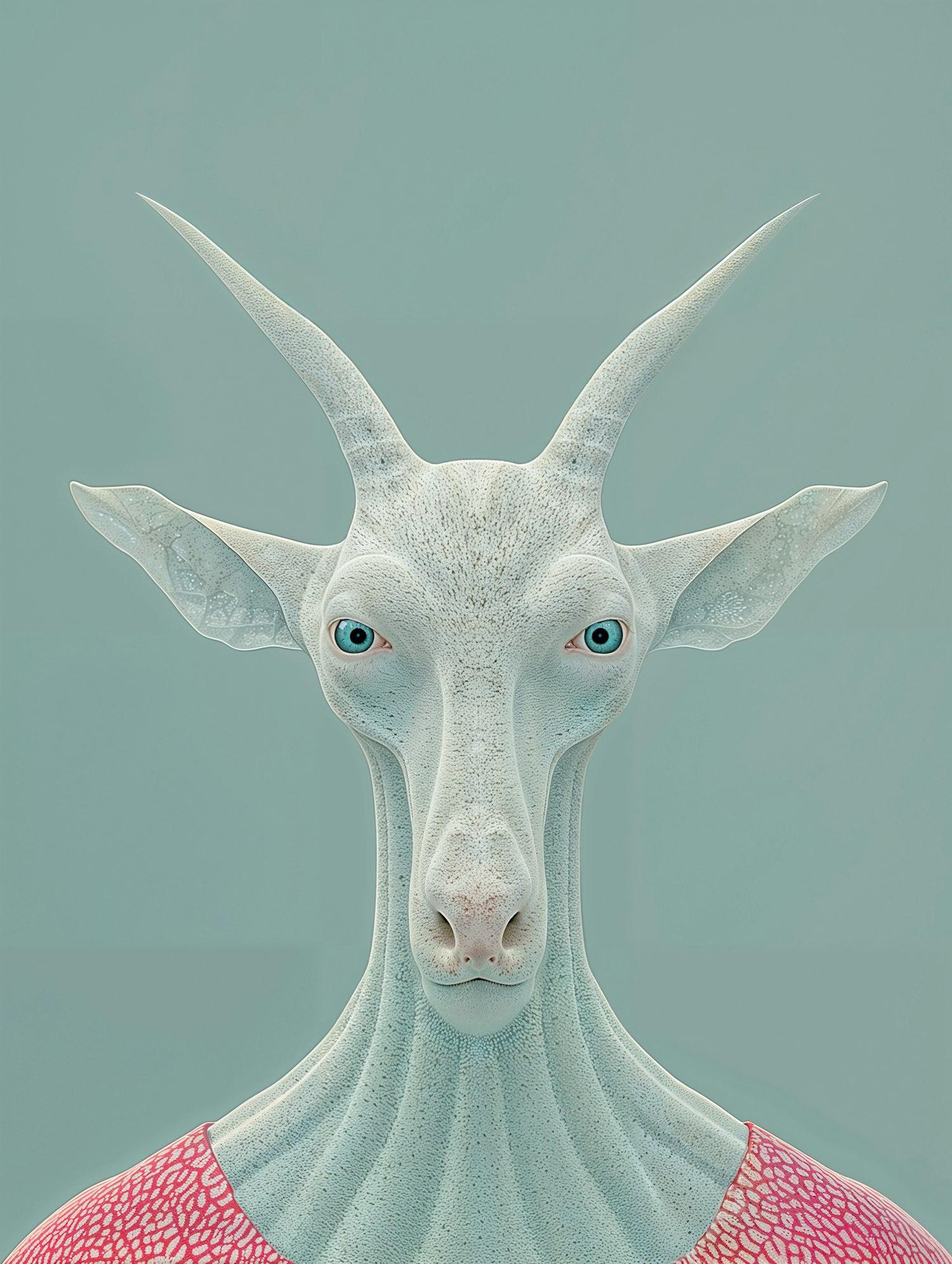 A surreal humanoid goat-like creature with pale skin, blue eyes, and horns, wearing a pink patterned garment against a teal background.