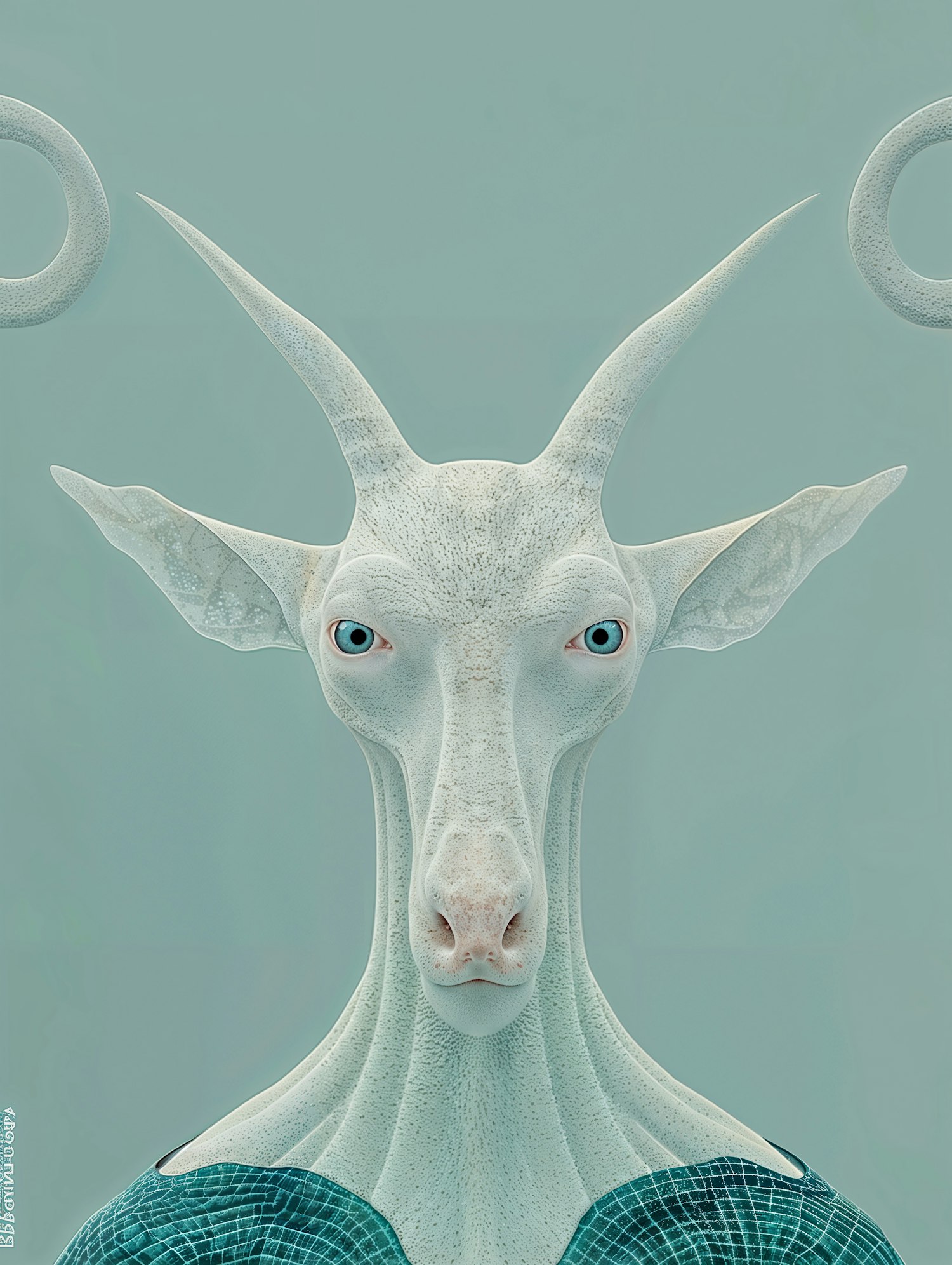 Surreal humanoid goat-like creature with textured skin, blue eyes, and teal accents, set against a muted teal background.