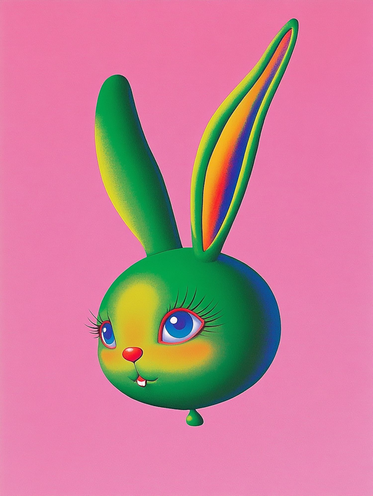 Whimsical green rabbit head with big blue eyes and colorful ears on a bright pink background. Playful and surreal illustration.