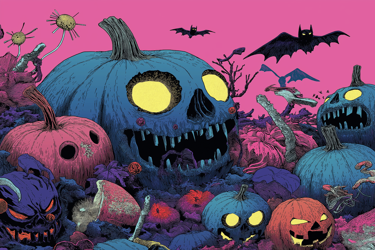 Surreal Halloween scene with colorful pumpkins, glowing eyes, and bats against a bright pink sky. Eerie and vibrant illustration.