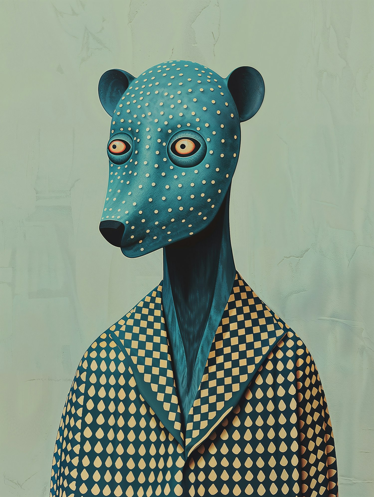 Surreal artwork of a humanoid figure with a blue, dotted animal-like head and a patterned coat, set against a muted green background.