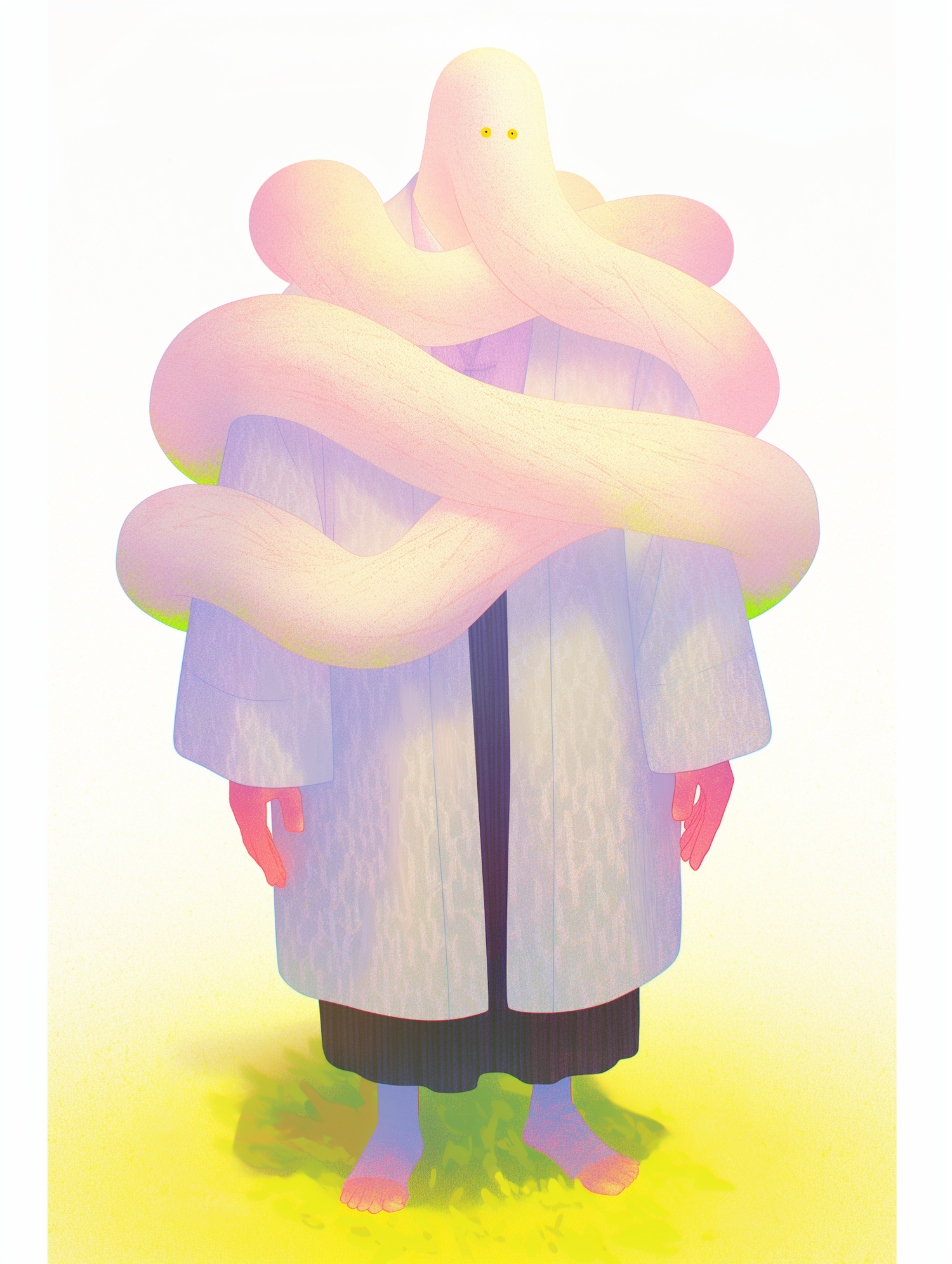 A surreal humanoid figure with a white robe and pink tentacle-like features, glowing yellow eyes, and a minimalistic background.