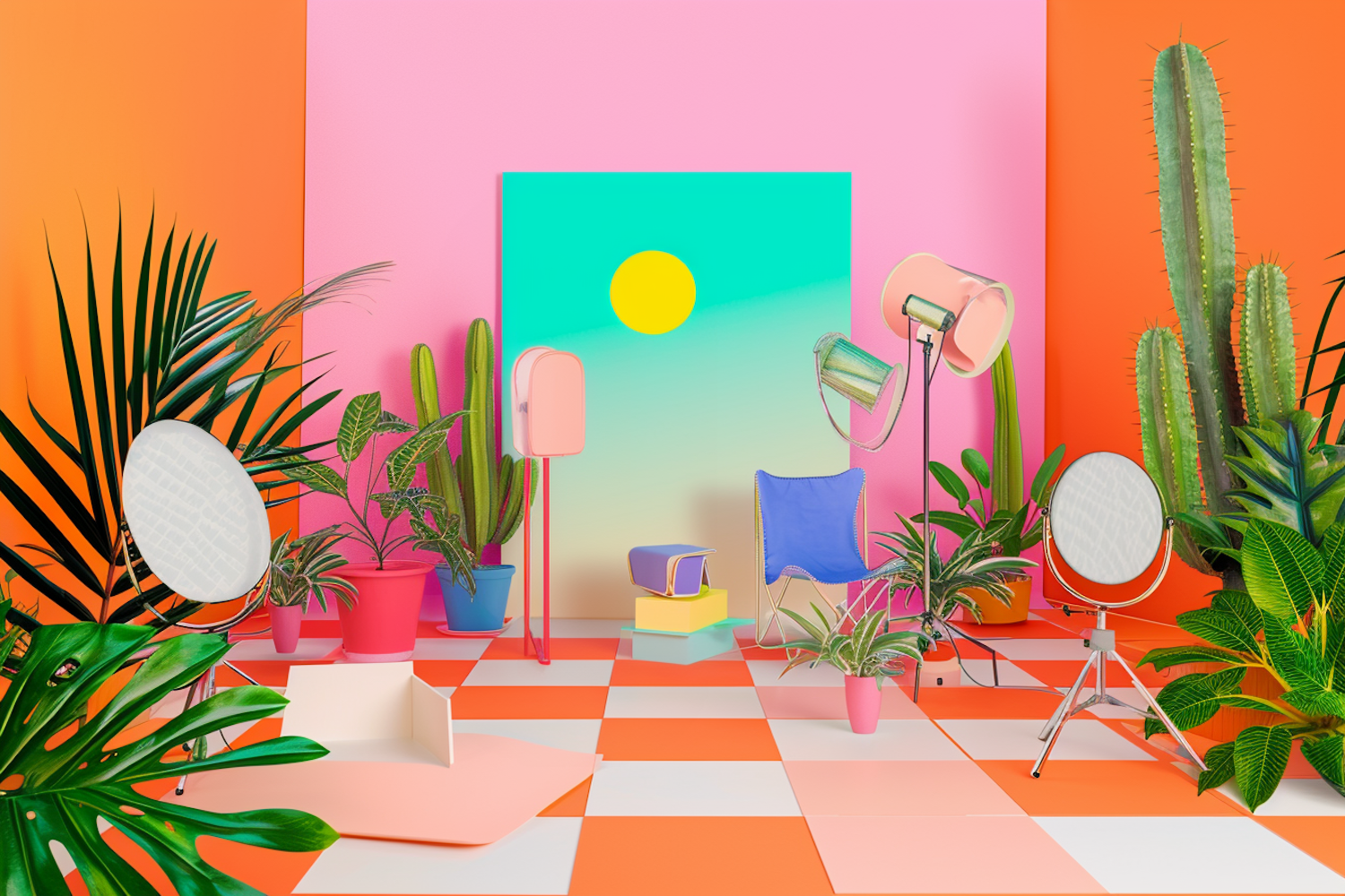 Vibrant room with colorful plants, modern decor, and a checkerboard floor. Bright orange and pink walls with a turquoise and yellow canvas.