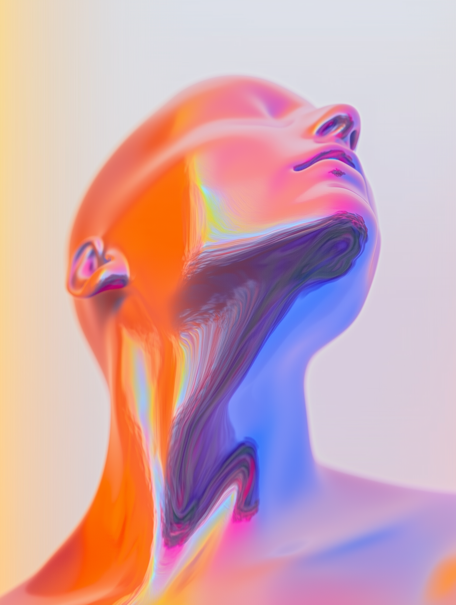 Abstract digital art of a human-like head in vibrant iridescent colors, blending orange, pink, and blue with a glossy, futuristic texture.