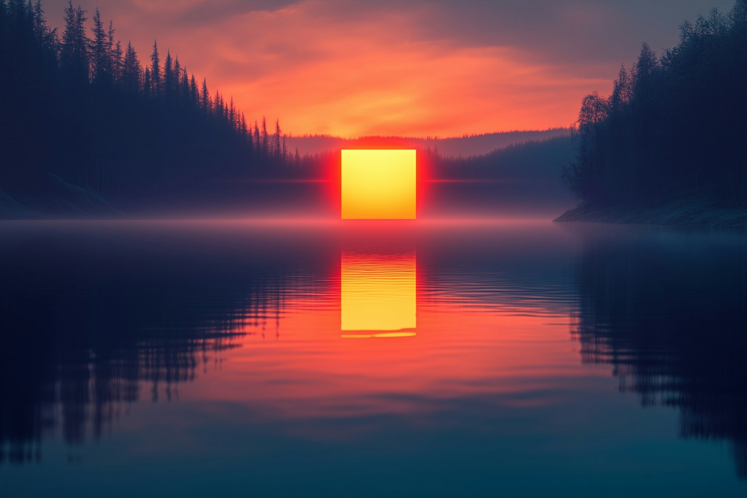 A glowing yellow square floats on a serene lake at sunset, surrounded by mist and framed by dark pine trees. Dreamlike and surreal.