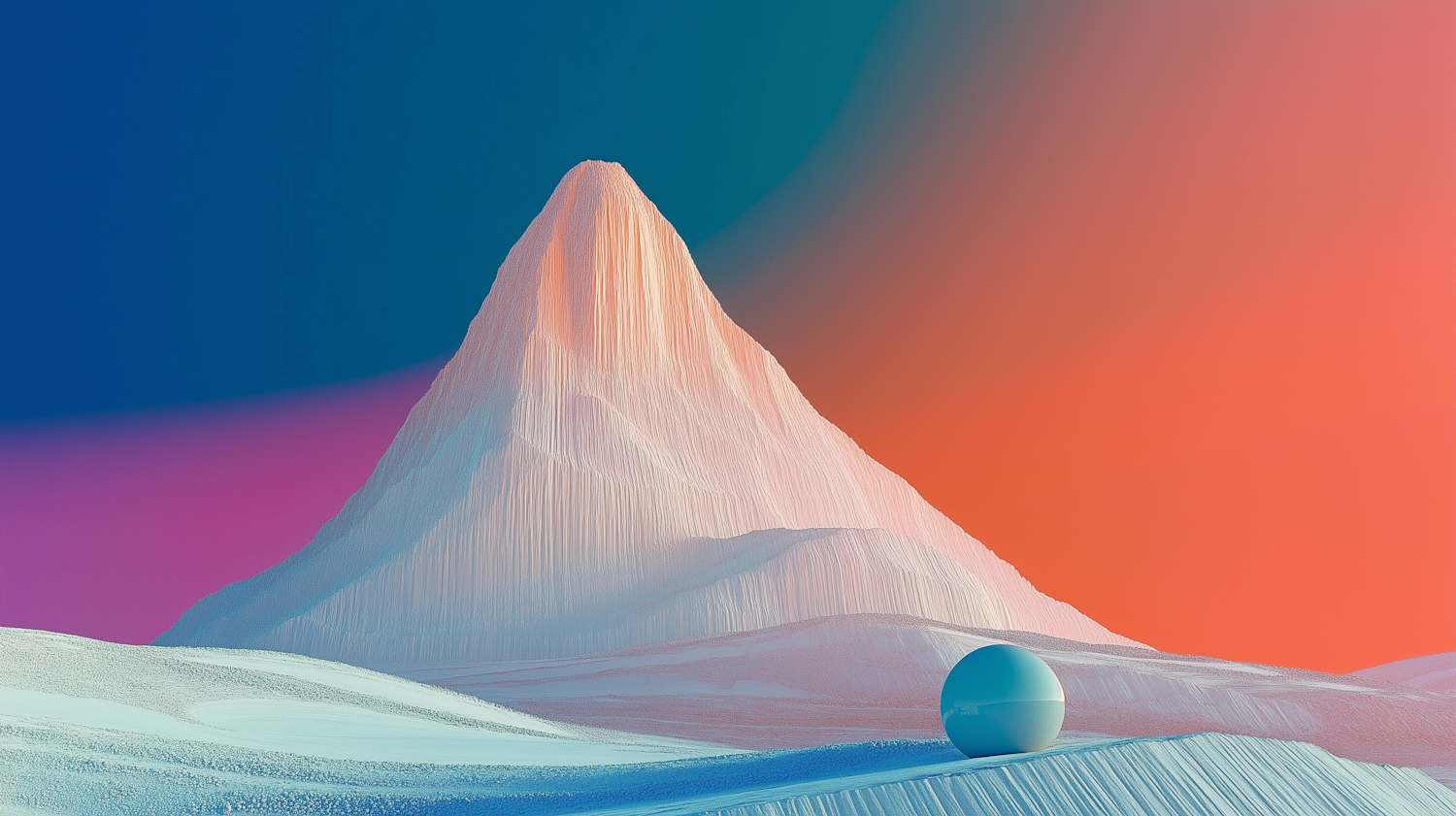 Surreal landscape with a colorful mountain and a glossy sphere, set against a vibrant gradient sky.