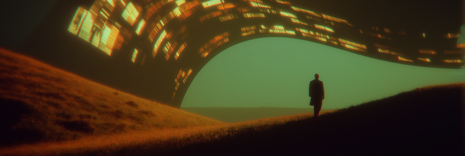 A surreal scene of a lone figure under a glowing, abstract structure in a warm, ethereal landscape. A blend of mystery and wonder.