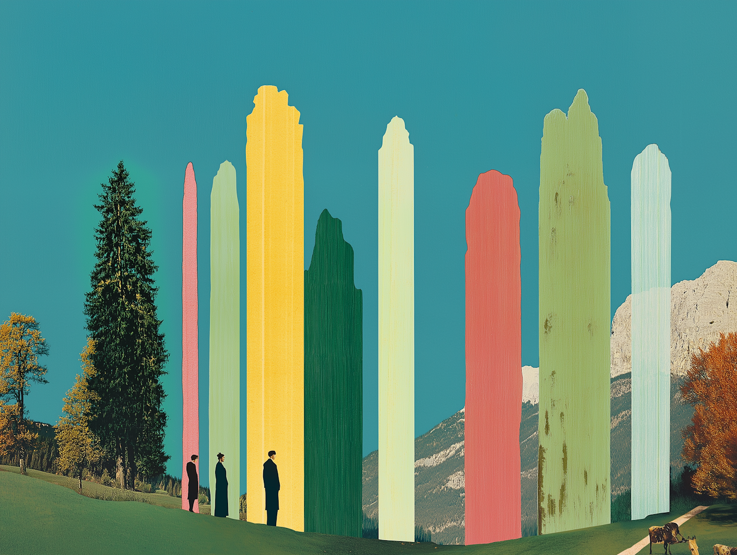 Surreal landscape with colorful abstract structures, silhouetted figures, and a mountain backdrop under a clear blue sky.
