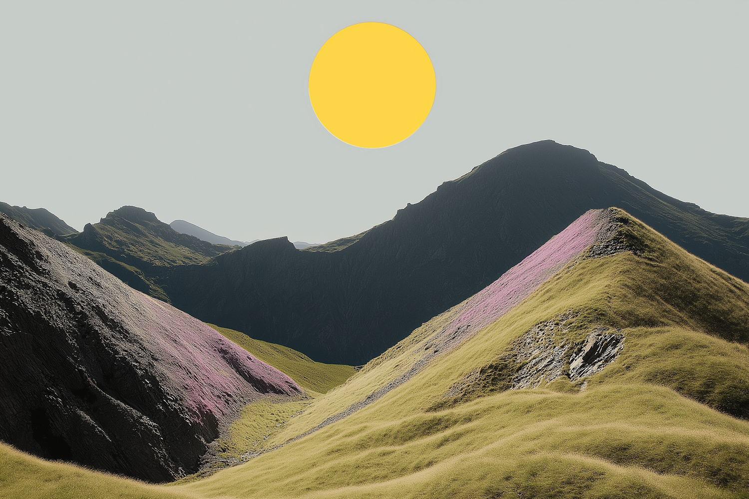 Surreal landscape with green hills, pink vegetation, and a large yellow sun against dark mountains and a pale sky.
