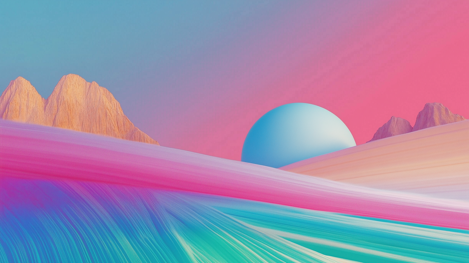 Surreal landscape with vibrant colors, featuring a blue sphere, multicolored terrain, and glowing mountains under a pink-blue sky.