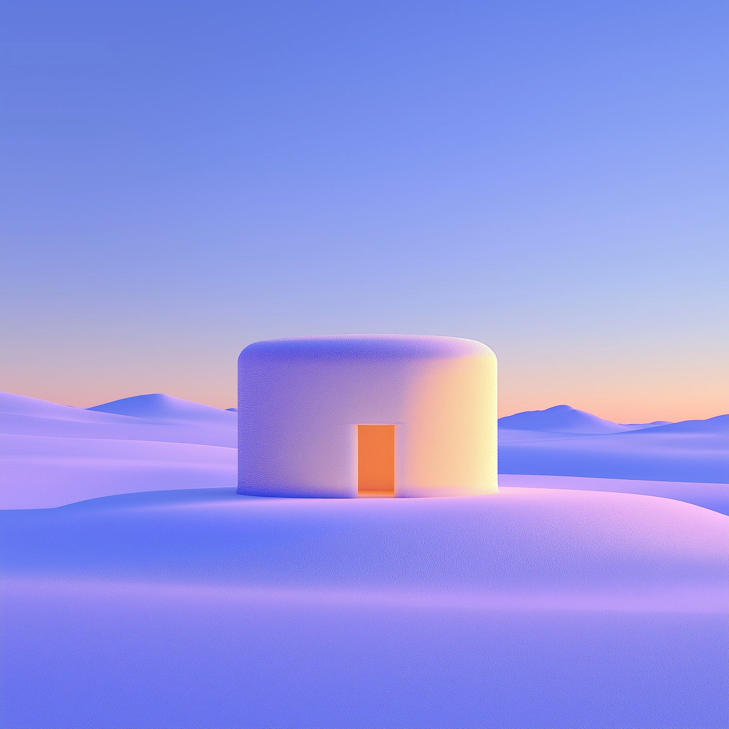 Minimalist 3D illustration of a glowing cube structure in a serene, pastel-colored landscape with a gradient sky.