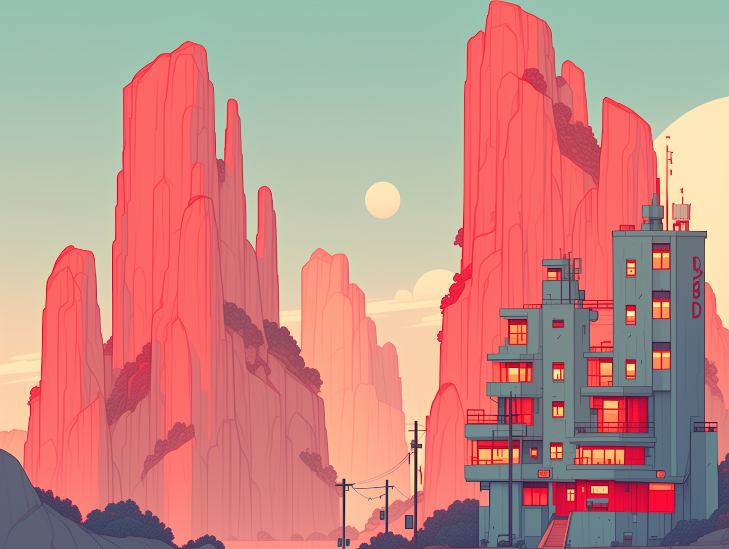 Futuristic building with glowing windows set against towering red rock formations under a soft gradient sky.