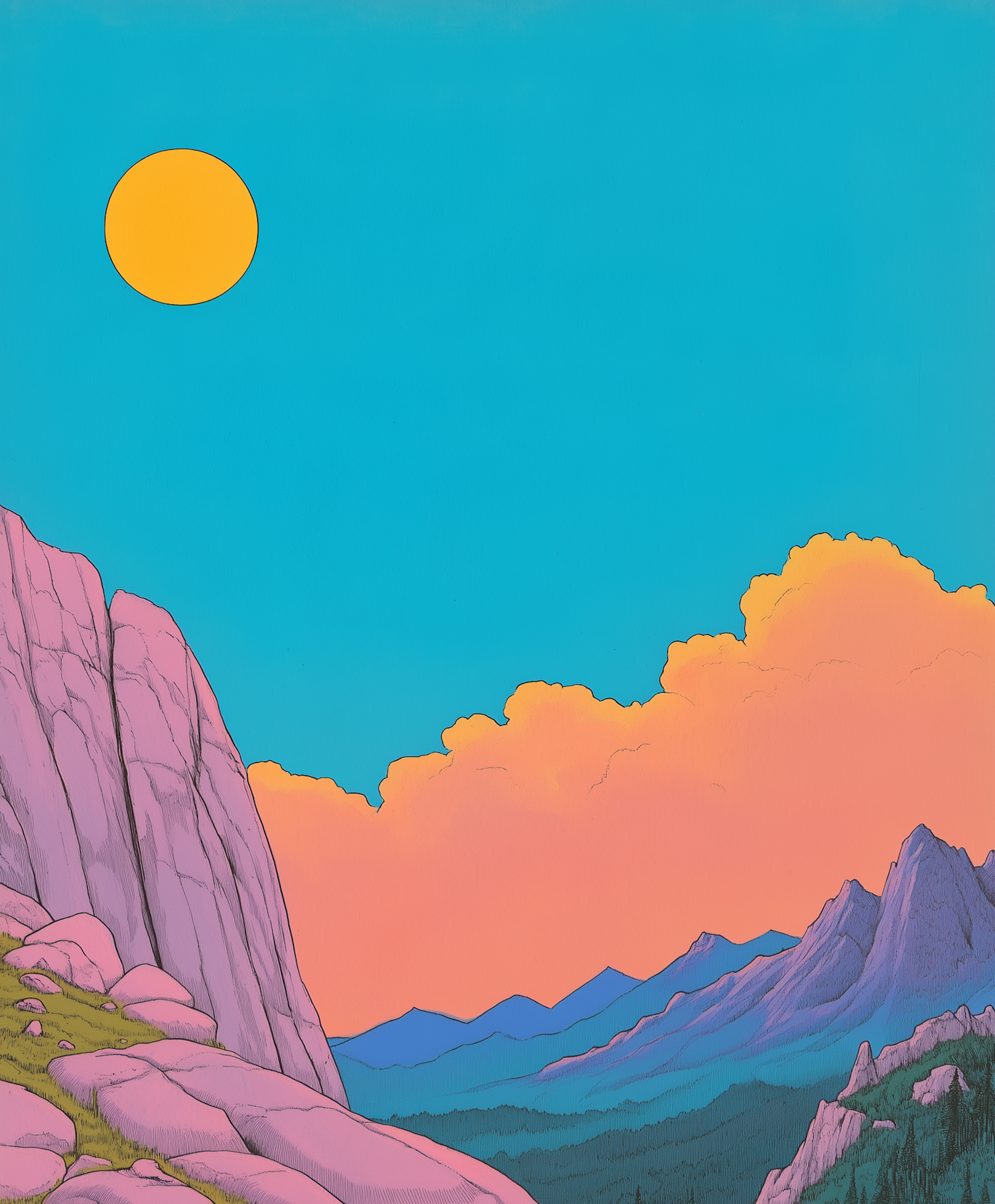 Vibrant illustration of a surreal mountain landscape with bold colors, featuring a bright sun, pink clouds, and rugged peaks.