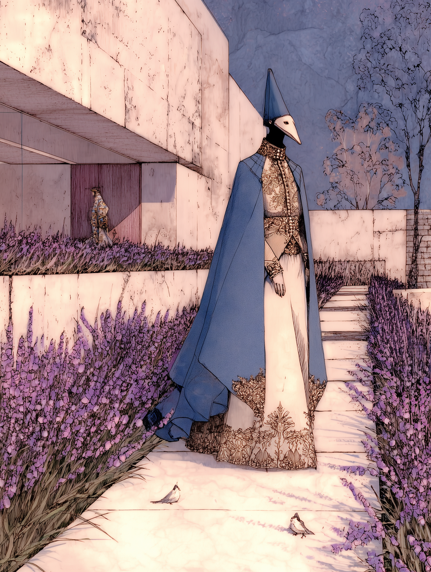 A surreal illustration of a masked figure in a blue cape walking through a lavender garden near modern architecture.